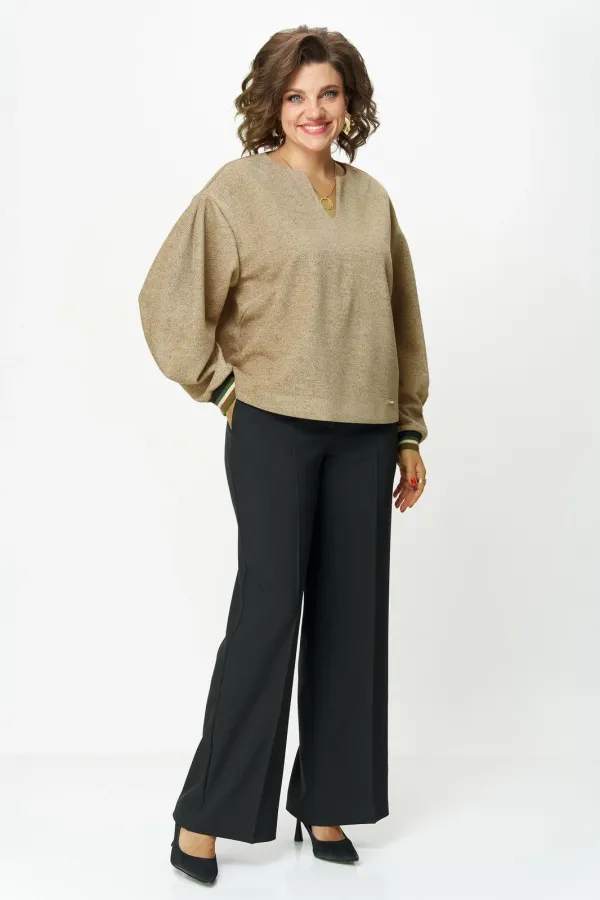 Комплект женский-двойка, блуза, свободного силуэта, из трикотажной ткани, вырез горловины V-образный,рукав немного спущенный, фигурный, спинка цельная. Длина по спинке 59 см Брюки-палаццо,средней ширины,из плотной текстильной ткани, выполнены с карманами с отрезным бочком в боковом шве. Пояс притачной, застёжка на молнию. По задним половинкам обработаны вытачки. Длина по боковому шву 108 см.