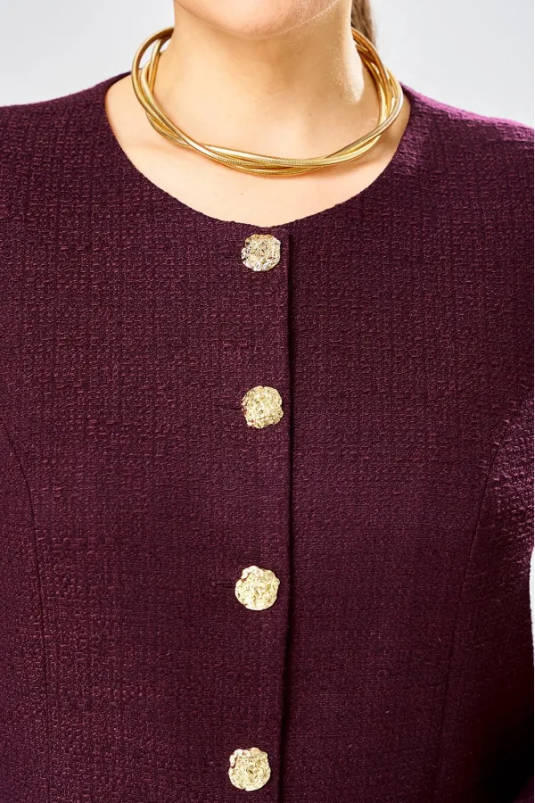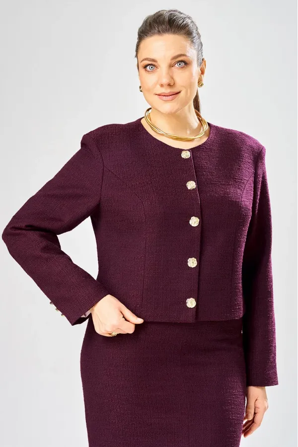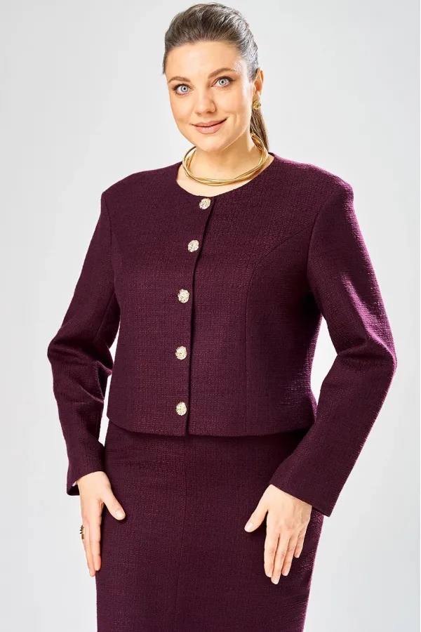 Жакет укороченный, прямого силуэта. Застежка центральная на петли пуговицы, горловина круглая. В жакете удлиненная линия плеча, рукава втачные, длинные, в локтевом шве, низу декоративные пуговицы.