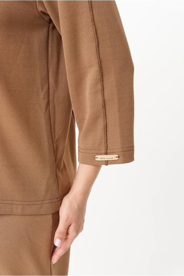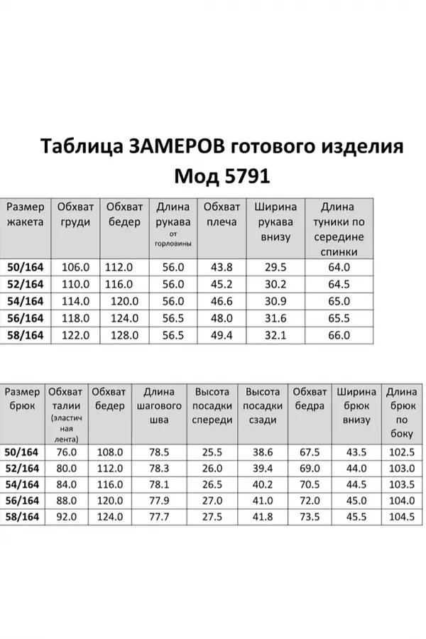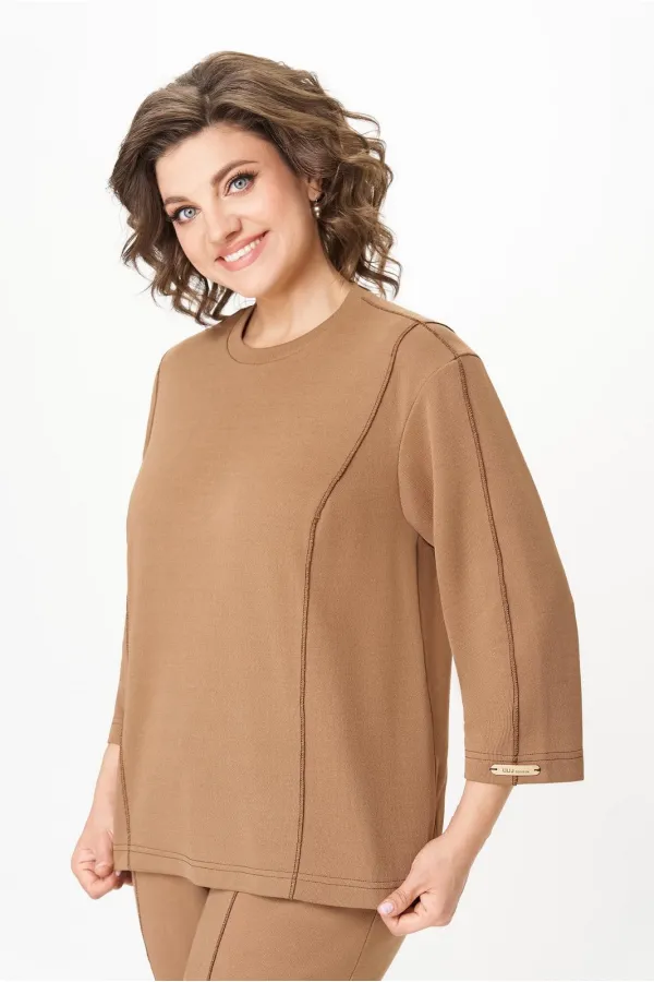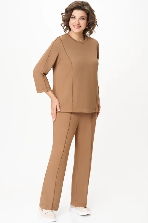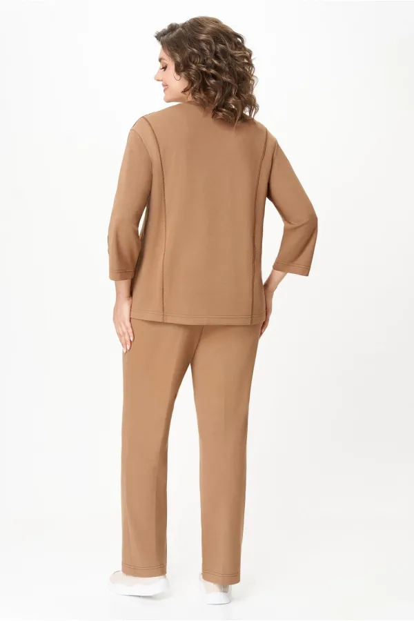 Костюм двух предметный из трикотажа, состоящий из блузки и брюк. Блузка прямого силуэта. По переду и спинке расположены рельефы с обмётанными срезами наружу. Спущенная линия плеча, рукав длиной 3/4. Горловина обработана бейкой. Низ блузки и рукава обработаны подгибом. По низу рукава пришивное украшение. Брюки прямого кроя. На передних половинках обработаны рельефы с обмётанными срезами наружу. Брюки без застёжки. Пояс притачной с круговой резинкой. Низ брюк обработан подгибом.