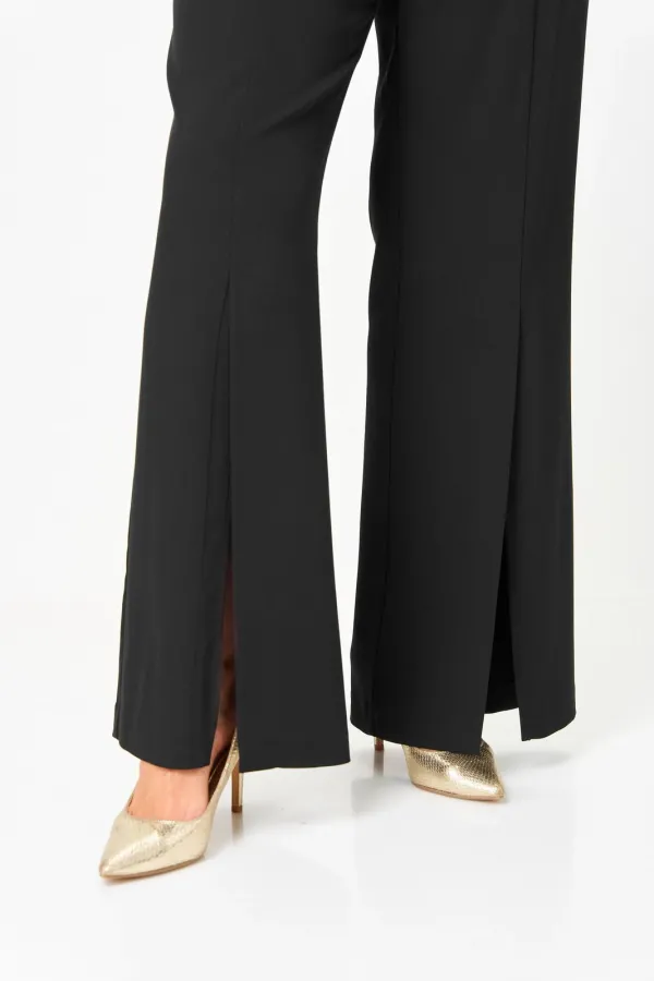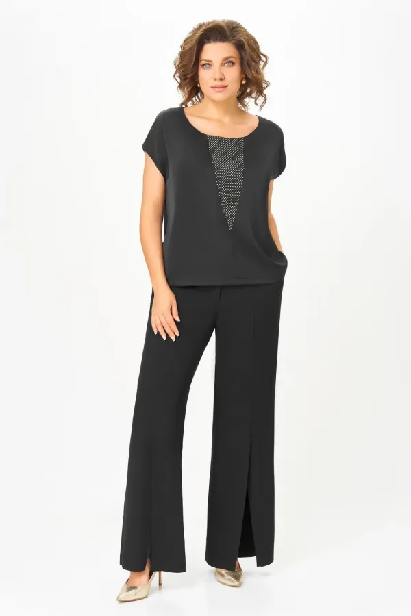 Брюки прямого силуэта, слегка расширенные к низу. По переду вертикальные швы, с высокими шлицами внизу. В боковых швах обработаны карманы. По спинке талевые выточки. Пояс приточной, с застежкой на 2 пуговицы и «молнию» спереди, с эластичной тесьмой сзади