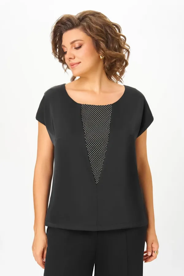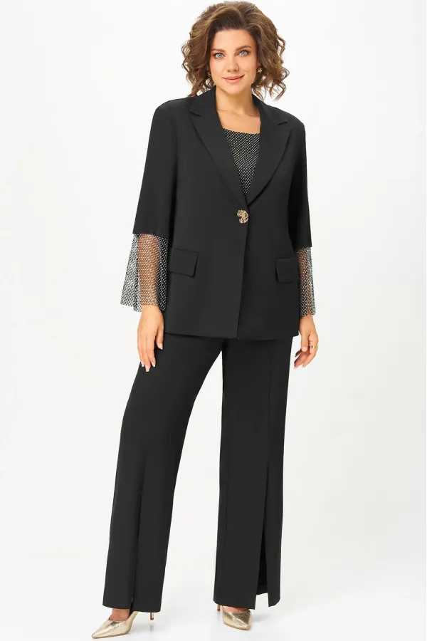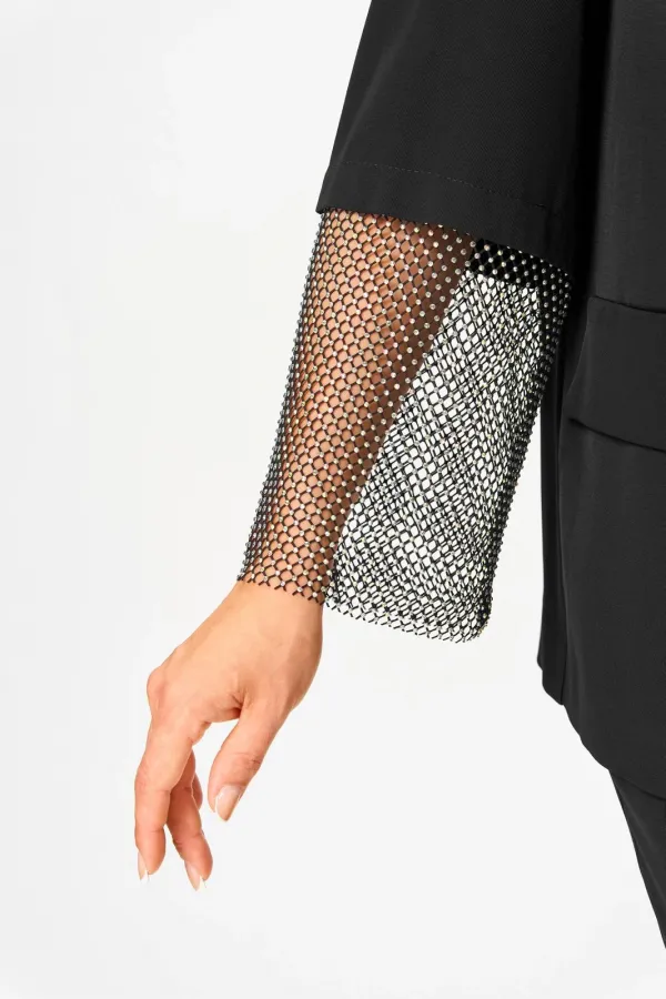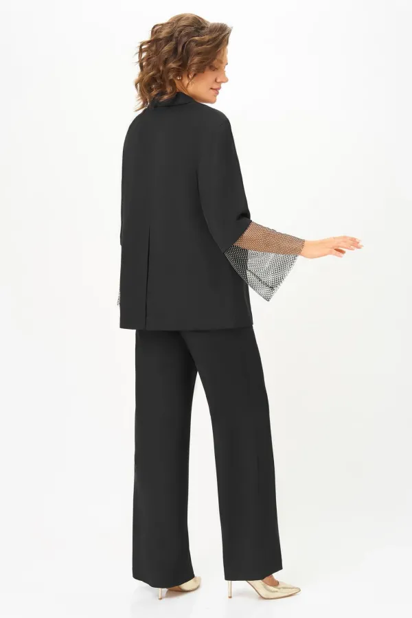 Рукав длинной, ¾, одношовный, с притачным низом из сетки со стразами. Жакет на подкладке по переду. Блузка прямого силуэта, со спущенным плечом и круглой горловиной. По переду нагрудные выточки, в боковых швах обработаны разрезы, по центру в-образная вставка из декоративной сетки со стразами. По спинке- центральный шов.