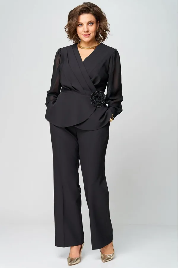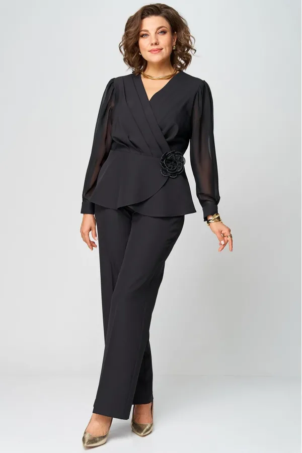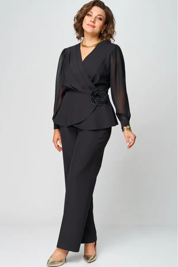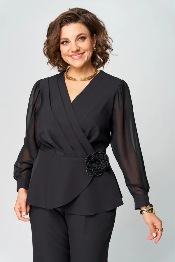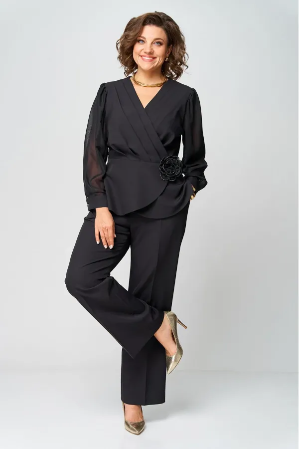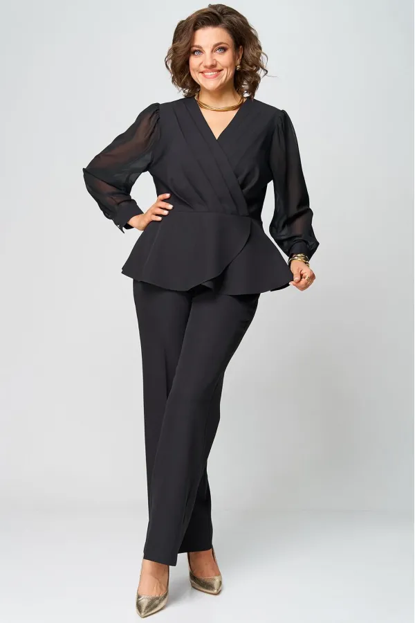 Супер-функциональный нарядный комплект, который состоит из нарядной блузки и брюк. Блузка – универсальная вещь в гардеробе женщины. Необычайно женственна, столь же переменчива и привлекательно вписывается в образ прекрасной дамы блузка с запахом. Стилисты ценят этот предмет одежды за то, что в его силах создавать множество эффектных луков, начиная от повседневных и заканчивая вечерними. В модели скомбинированы две фактуры ткани. Наша блуза с объемными шифоновыми рукавами на манжетах. Модель приталенного силуэта. Запах образует на блузке V-образный вырез, который хорошо подчеркивает шею, несколько удлиняет ее, делая линию плеча более узкой, а фигуру в целом – стройнее. Кроме того, за счет запаха талия визуально сужается и силуэт становится более приближенным к идеальной фигуре – песочные часы. Такой верх можно успешно сочетать с брюками, юбками, шортами, формируя образ деловой романтичной, активной и утончённой дамы.
