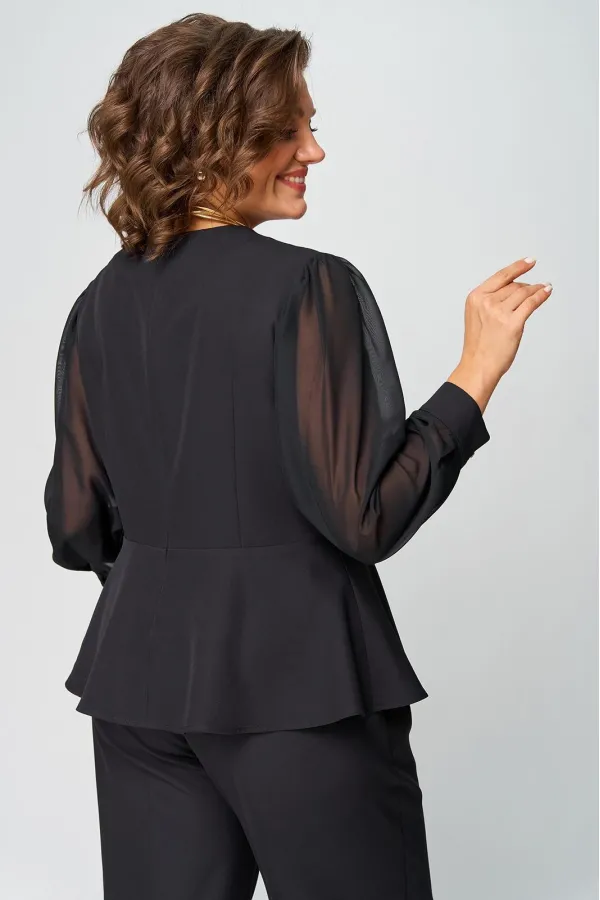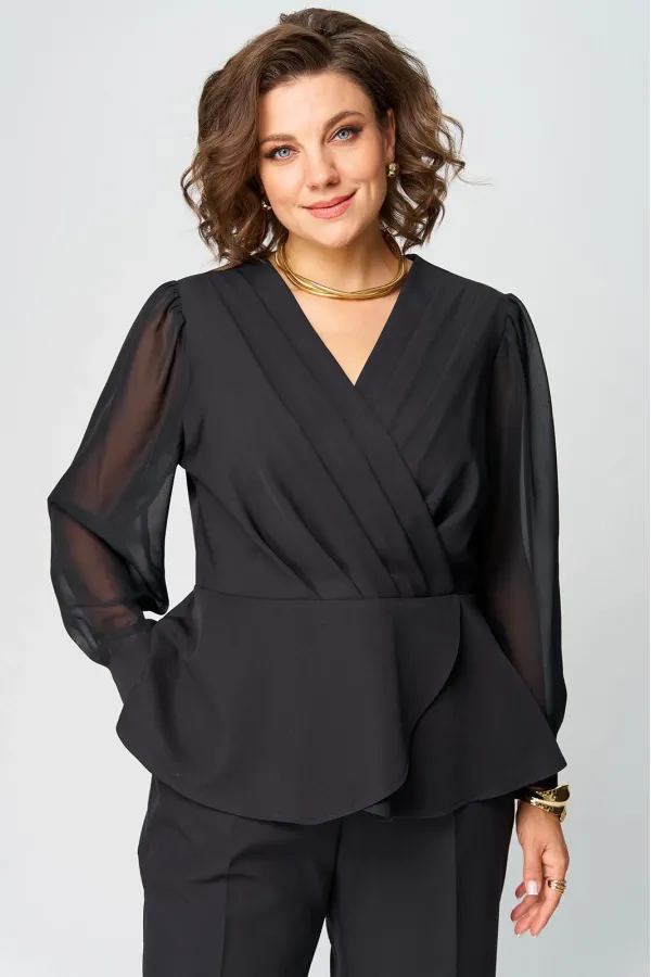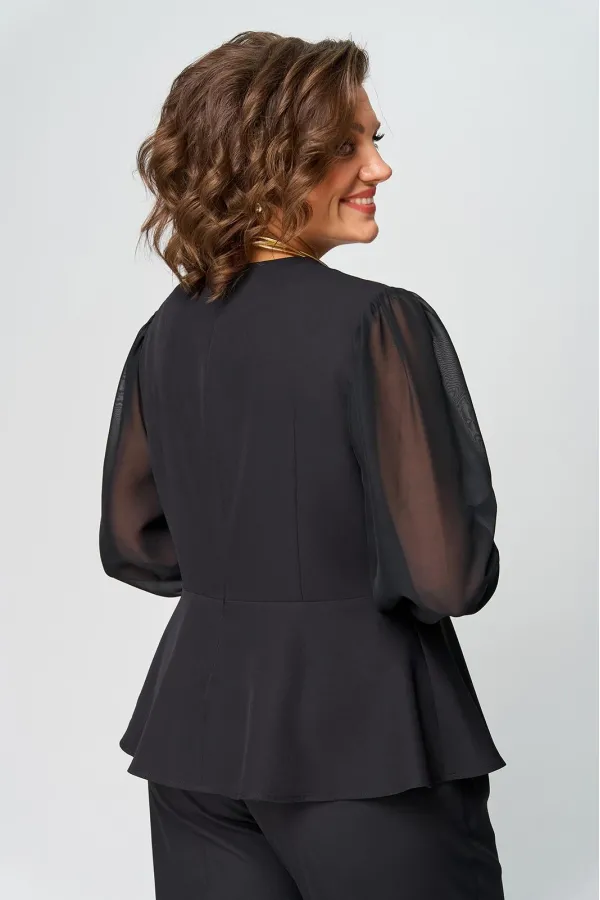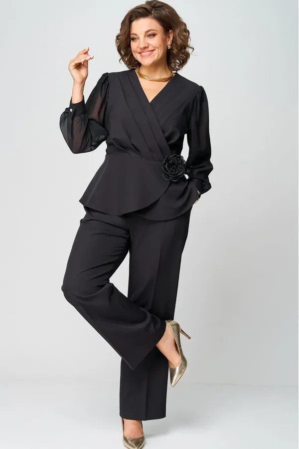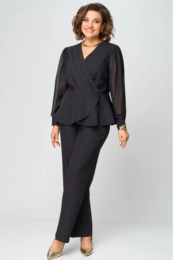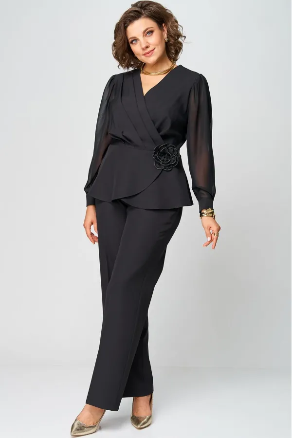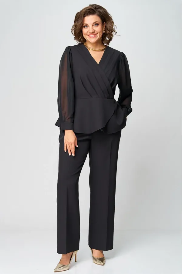 Супер-функциональный нарядный комплект, который состоит из нарядной блузки и брюк. Блузка – универсальная вещь в гардеробе женщины. Необычайно женственна, столь же переменчива и привлекательно вписывается в образ прекрасной дамы блузка с запахом. Стилисты ценят этот предмет одежды за то, что в его силах создавать множество эффектных луков, начиная от повседневных и заканчивая вечерними. В модели скомбинированы две фактуры ткани. Наша блуза с объемными шифоновыми рукавами на манжетах. Модель приталенного силуэта. Запах образует на блузке V-образный вырез, который хорошо подчеркивает шею, несколько удлиняет ее, делая линию плеча более узкой, а фигуру в целом – стройнее. Кроме того, за счет запаха талия визуально сужается и силуэт становится более приближенным к идеальной фигуре – песочные часы. Такой верх можно успешно сочетать с брюками, юбками, шортами, формируя образ деловой романтичной, активной и утончённой дамы.
