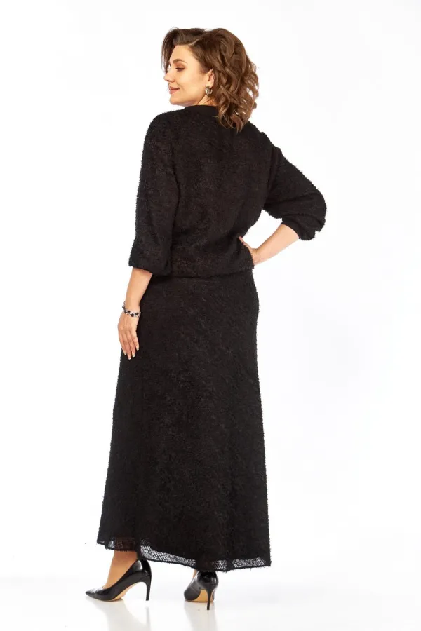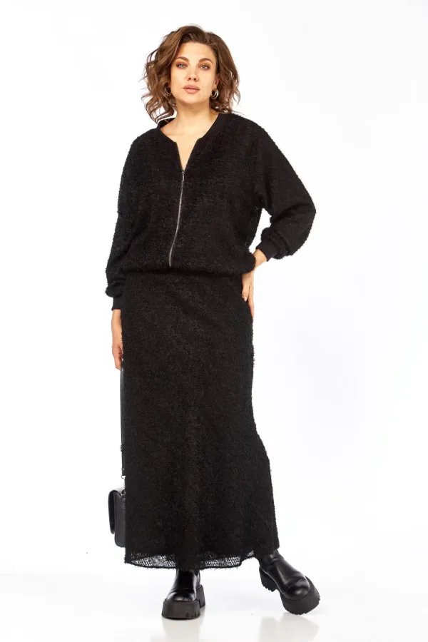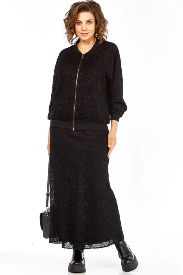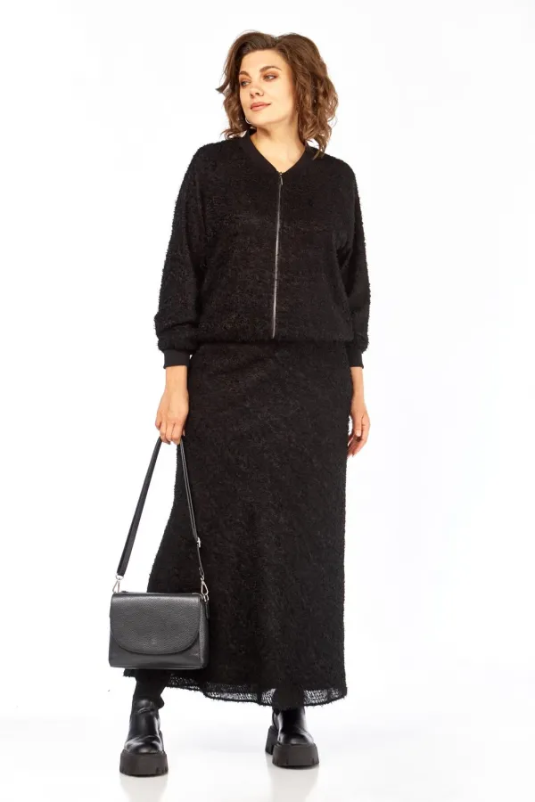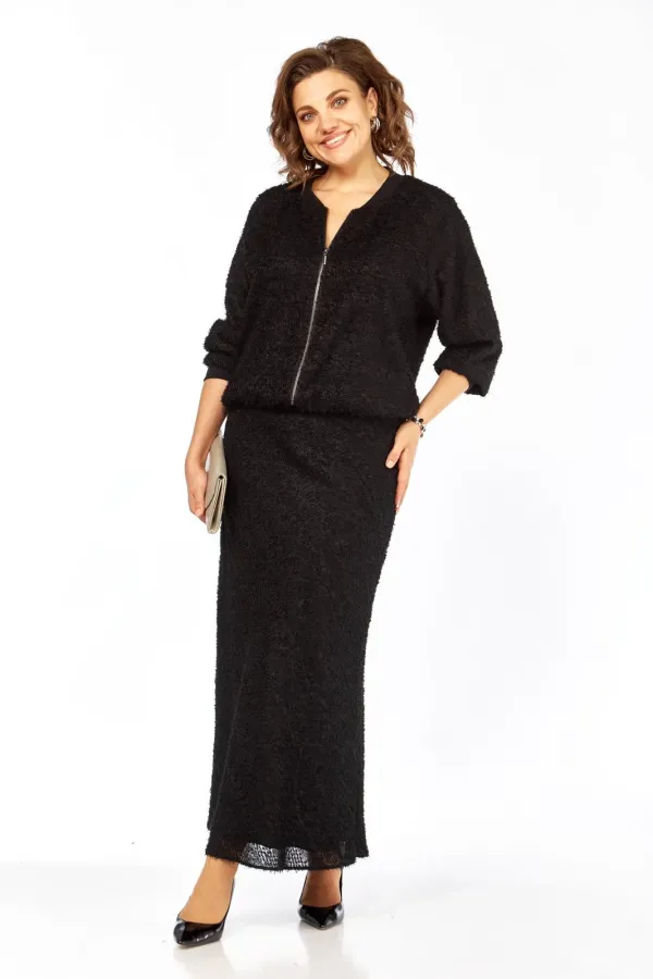 Костюм женский с юбкой. Кофта с центральной застежкой на тесьму-молнию, рукава-реглан. По низу изделия и низу рукава - манжет из отделочной ткани. По горловине воротник-стойка из отделочной ткани. Кофта на подкладке. Юбка длинная, верхний рсез обработан поясом с резинкой сзади. Застежка в левом боковом шве на тесьму молнию, петлю-пуговицу. Юбка на подкладке.