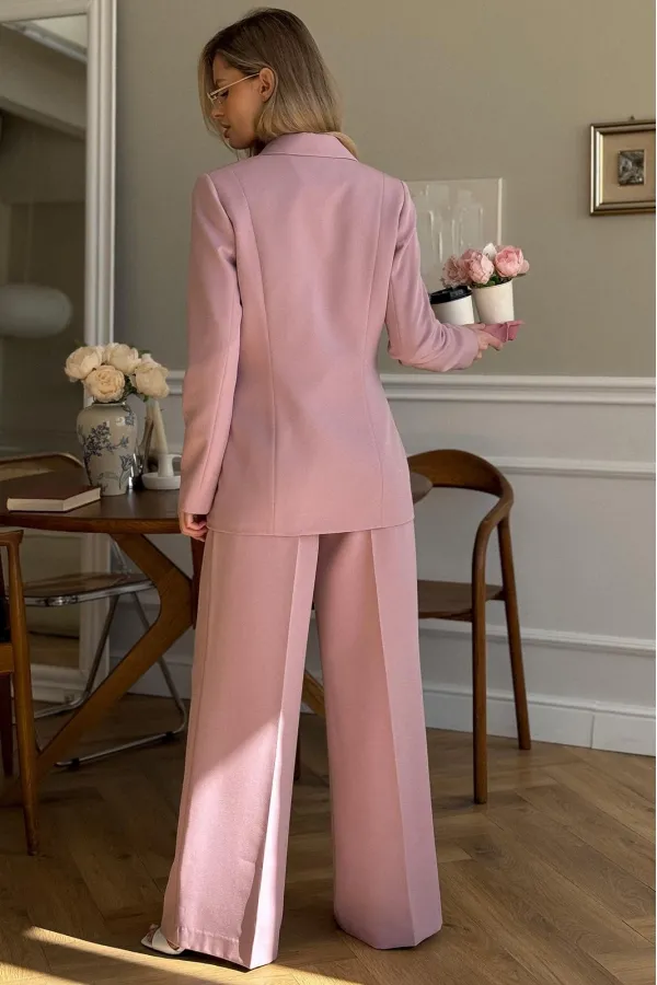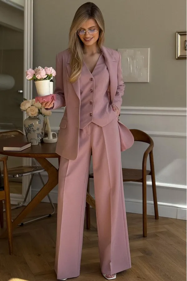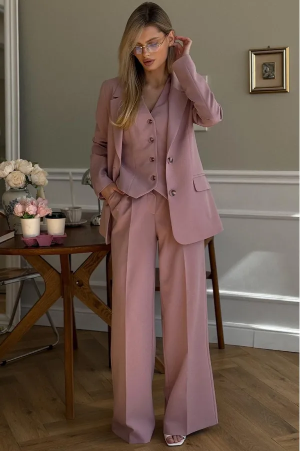 Брюки - палаццо с центрально застежкой на тесьму молнию с гульфиком и откоском; с притачным поясом со шлевками, застегивающимся на 1 прорезную петлю и пуговицу. Задняя часть пояса - на резинке. П П брюк со складками, переходящими в стрелки и боковыми карманами. З П брюк с 2-мя парами таллиевых вытачек и стрелками. Жилет прилегающего силуэта с центральной бортовой застежкой на 4 прорезные петли и пуговицы. Перед - с талиевыми вытачками и отрезным бочком. Спинка со средним швом и рельефами от проймы до низа, в которые на уровне талии втачаны хлястики. Хлястики с запахом; закреплены на 2 пуговицы. Вырез горловины V-образный. Жилет на подкладке. Длина жакета - 71,2 см. Длина рукава жакета - 62,7 см. Длина жилета — 49,5 см. Ширина плеча жилета — 7,2 — 7,6 см. Длина брюк - 120,5 см.