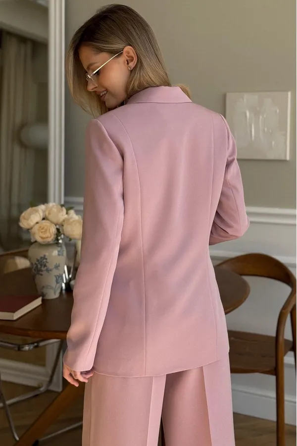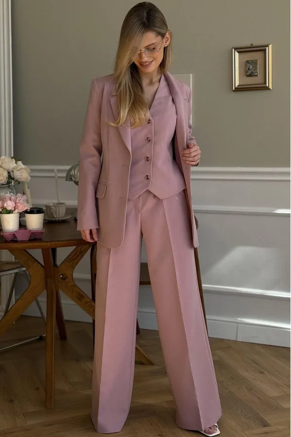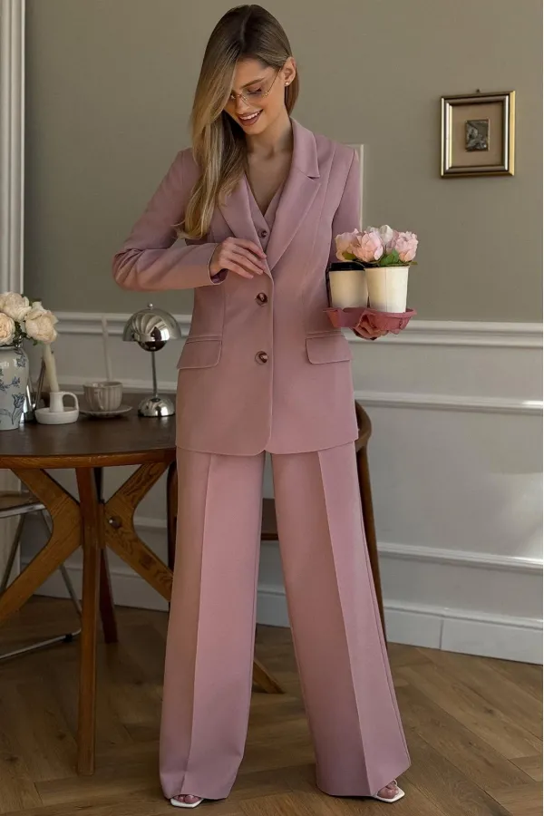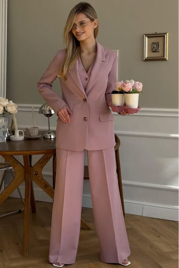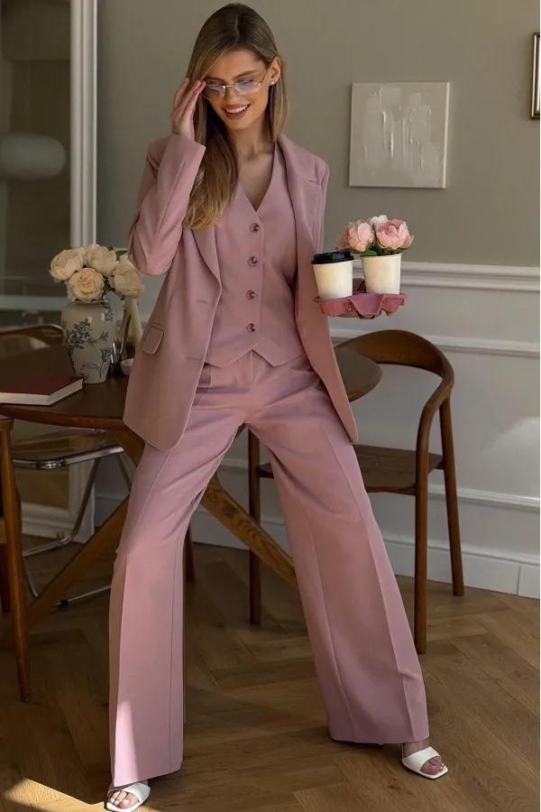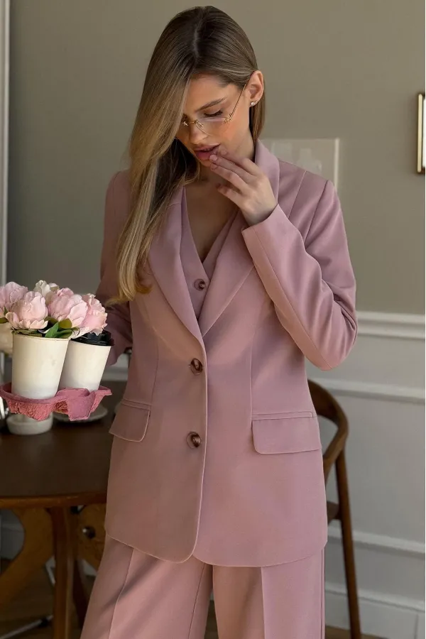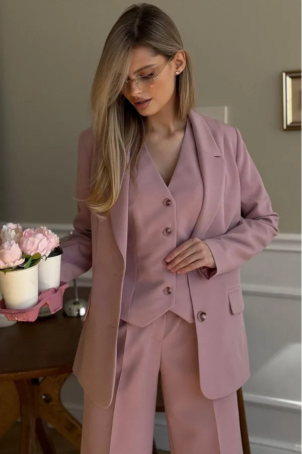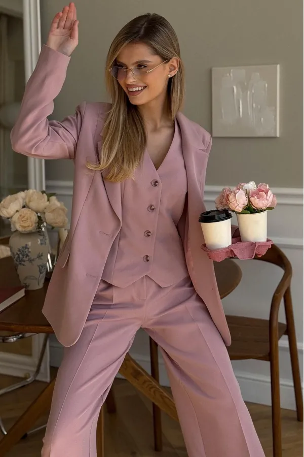 Костюм (тройка – Жакет, брюки, жилет). Костюм женский, состоящий из жакета, жилета и брюк. Жакет полуприлегающего силуэта, длинной ниже линии бедер. Спинка с вертикальными рельефами. Перед с центрально-бортовой застежкой на 2 петли-пуговицы и воротником пиджачного типа, вертикальными рельефами, доходящими до линии кармана в рамку с клапаном. Рукава втачные двухшовные. Жакет на подкладке.