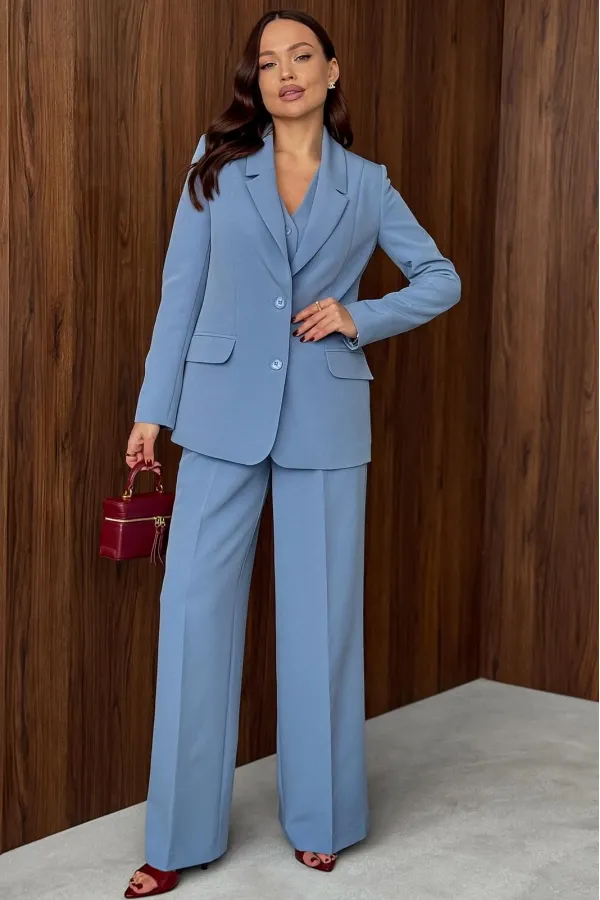 Костюм (тройка – Жакет, брюки, жилет). Костюм женский, состоящий из жакета, жилета и брюк. Жакет полуприлегающего силуэта, длинной ниже линии бедер. Спинка с вертикальными рельефами. Перед с центрально-бортовой застежкой на 2 петли-пуговицы и воротником пиджачного типа, вертикальными рельефами, доходящими до линии кармана в рамку с клапаном. Рукава втачные двухшовные. Жакет на подкладке.