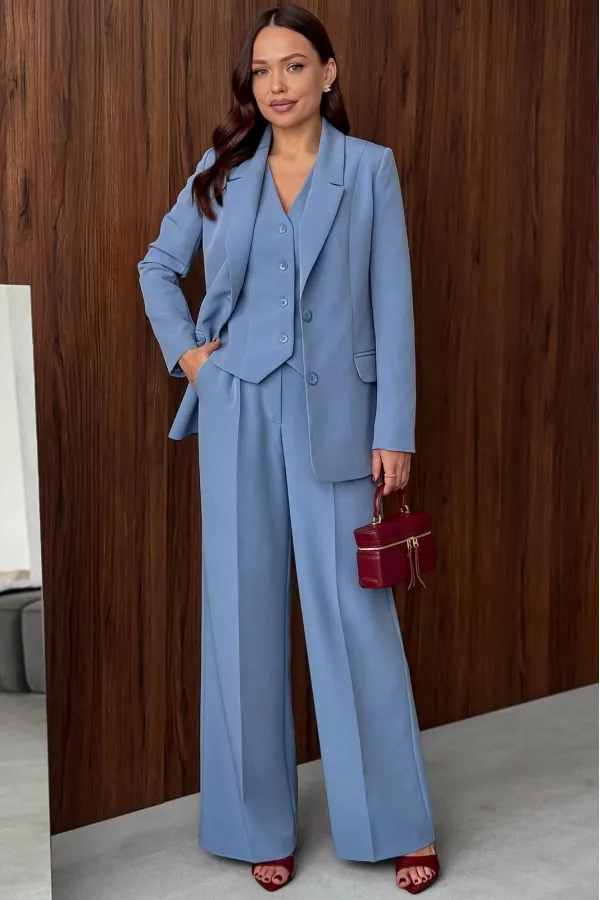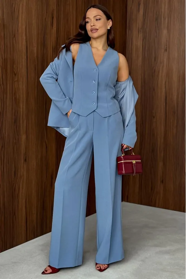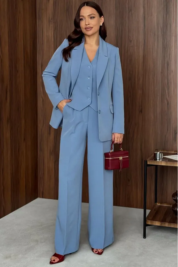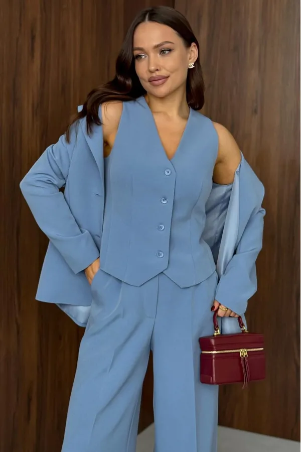 Костюм (тройка – Жакет, брюки, жилет). Костюм женский, состоящий из жакета, жилета и брюк. Жакет полуприлегающего силуэта, длинной ниже линии бедер. Спинка с вертикальными рельефами. Перед с центрально-бортовой застежкой... Читать далее...