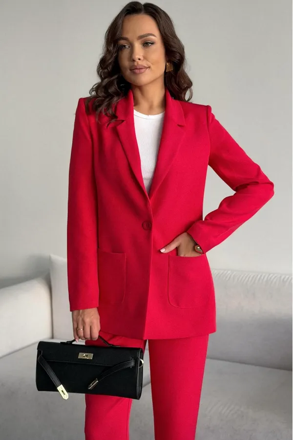 Жакет с центрально-бортовой застежкой на одну петлю-пуговицу и воротником пиджачного типа.