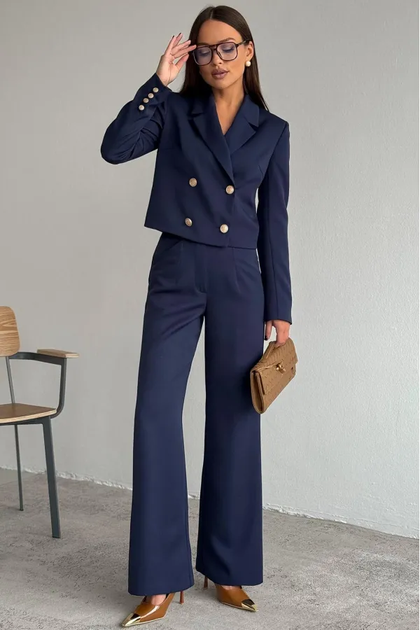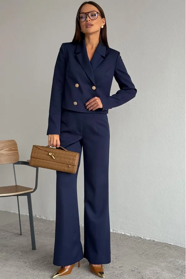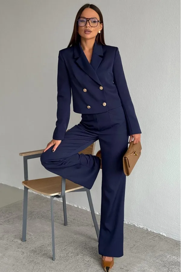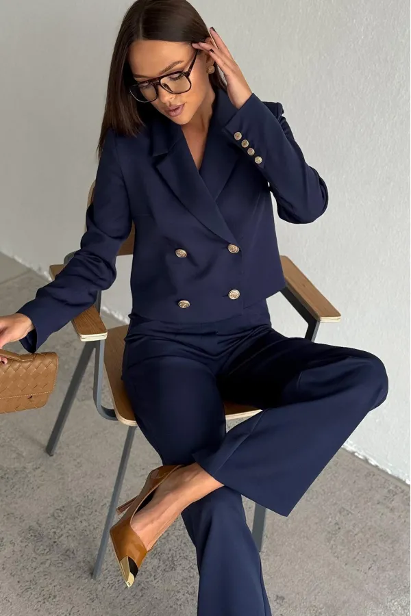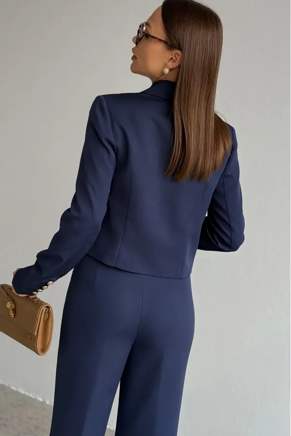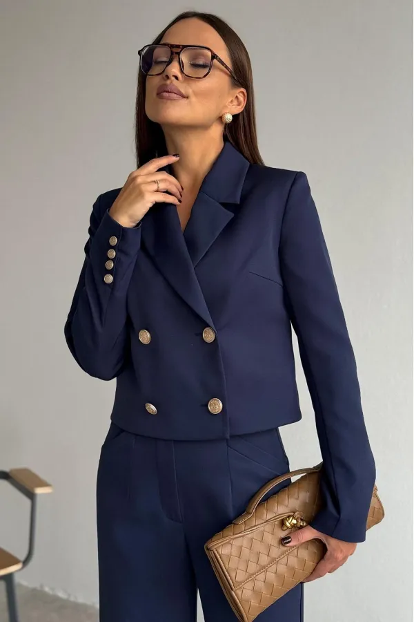 Жакет укороченный, полуприлегающего силуэта, с втачным рукавом. Спинка с таллиевыми вытачками. Перед с нагрудными вытачками из бокового шва, центральной двубортной застежкой на две пары петель пуговиц и воротником пиджачного типа. Рукава втачные, двух-шовные с обработанной шлицей обманкой на 4 петли- пуговицы. Жакет на подкладке.