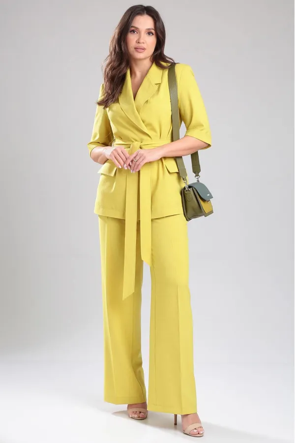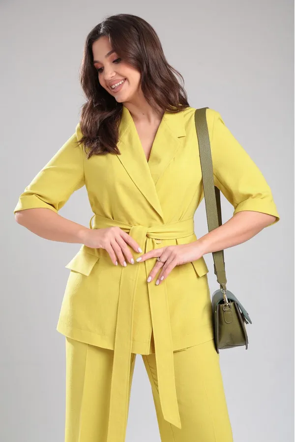 Летний брючный комплект из облегченной костюмной ткани “Лён-Вишер”. Жакет двубортный с застежкой на петли, пуговицы, под пояс (пояс в комплекте), рукав втачной, короткий, с отворотом, по полочкам прорезные карманы с клап... Читать далее...
