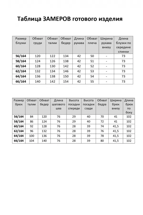 | Ткань | Блузка – полиэстер 100% (шифон). Брюки – полиэстер 50% вискоза 50% |