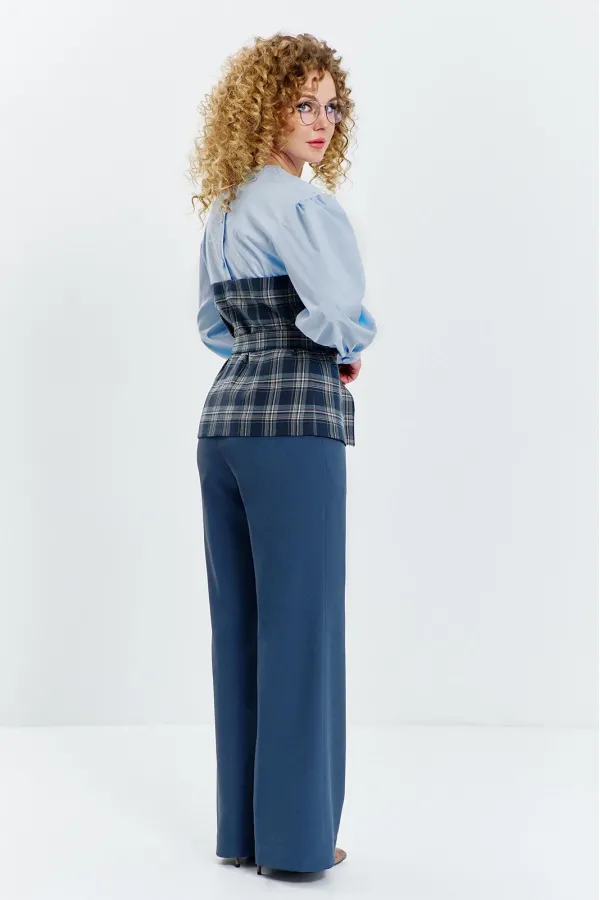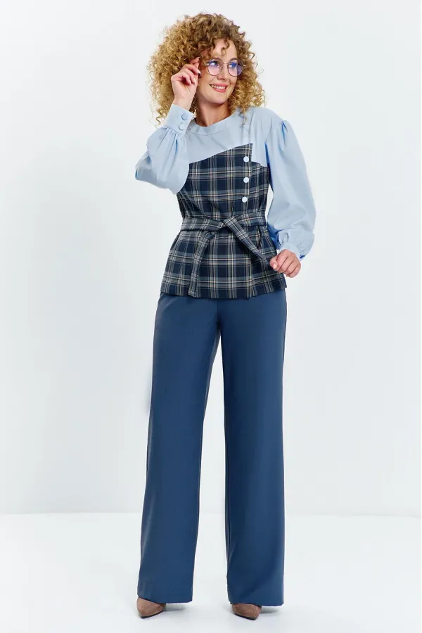 Костюм женский двухпредметный, выполнен из сочетания хлопковой и костюмной ткани, состоит из блузона и брюк. Блузон с имитацией асимметричного корсета, горловина- округлая, рукав приспущенный втачной длинный с манжетой по низу. Спинка разрезная с застежкой петли-пуговицы. Брюки с завышенной посадкой, на притачном поясе с резинкой в боковых швах расположены карманы. Застежка молния на гульфике