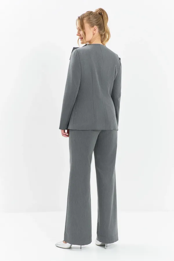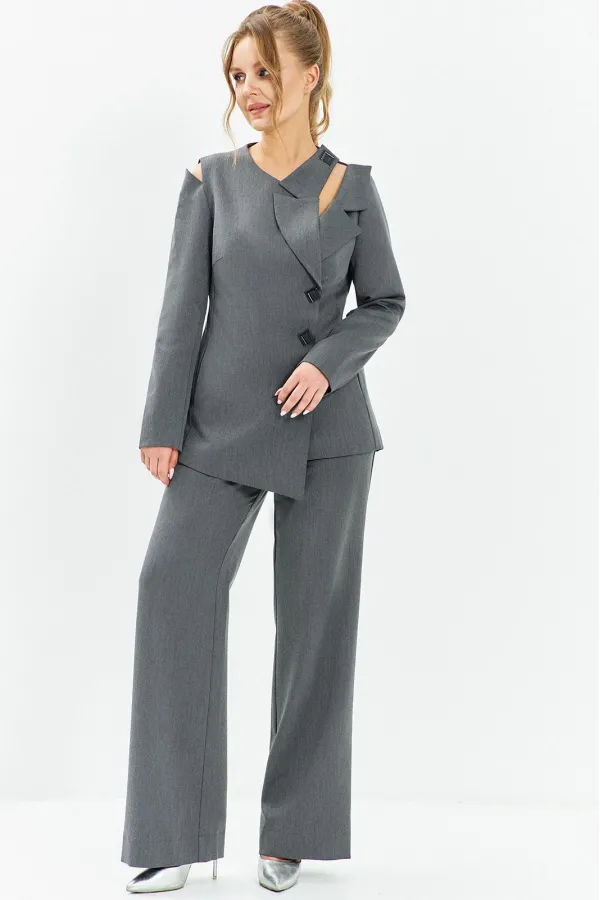 Костюм женский двухпредметный состоит из жакета и брюк, жакет приталенный двубортный, по переду жакета расположена декоративная прорезь имитирующая воротник с лацканами, горловина жакета- лодочка, рукав втачной асимметрично расположена прорезь на плече. На полочке жакета имеются потайные карманы. Жакет на полной подкладке. Брюки классические прямые, на притачном поясе с резинкой, в боковых швах брюк имеются карманы с отрезным бочком.