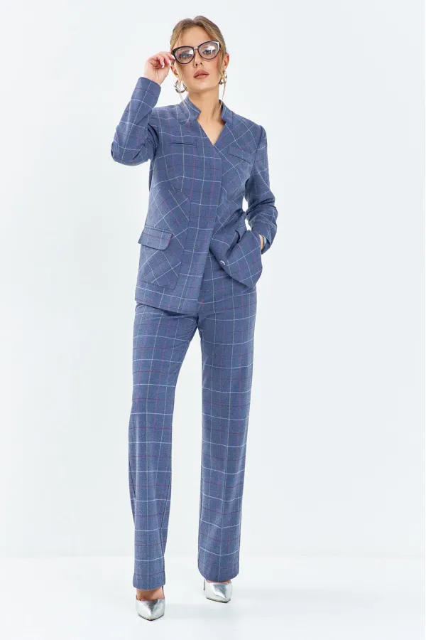 Костюм женский 2-х предметный состоит из жакета и брюк, Жакет полуприлегающего силуэта выполнен из костюмной ткани, по полочке жакета расположена накладная деталь с функциональным прорезным карманом рамка, и декоративные фальш-карманы в области груди. Рукав втачной длинный. горловина обработана плоско лежащим воротником -стойкой. Застежка жакета - потайная (супатная) на петли-пуговицы. Жакет на полной подкладке.Брюки классического кроя, прямые от бедра, с высокой посадкой. Пояс в брюках втачной с резинкой, застежка молния на гульфике и петля - пуговица
