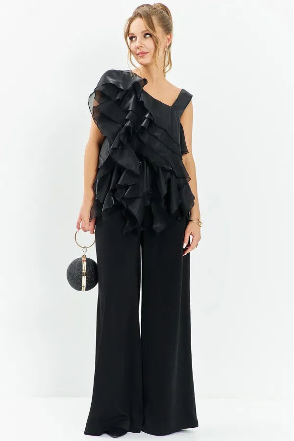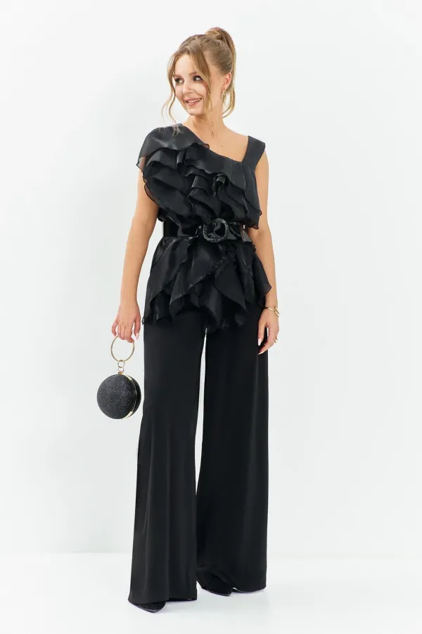 Костюм вечерний с брюками и блузой. Блуза с настрочными воланами из органзы по полочке, горловина асимметричная, изделие без рукавов, на спинке блузы таллиевые выточки. Брюки палаццо с высокой посадкой расширенные к низу, изделие на притачном поясе с резинкой по поясу, в боковых швах имеются карманы. Брюки без молнии и пуговицы