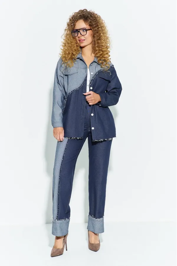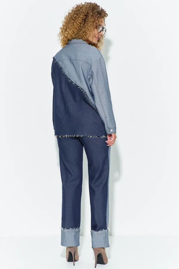 Костюм женский выполнен из денима (джинсы) состоит из джинсовой рубашки и брюк. Рубашка асимметричного кроя с декоративным подрезом и кокеткой, на полочках расположены потайные карманы с клапаном и рельефы.горловина- плосколежащий отложной воротник. Рукав вточной приспущенный, низ рукава обработан манжетой с застежкой петля- пуговица. Спинка изделия разрезная с рельефами и с декоративным асимметричным подрезом и бахромой. Низ рубашки обработан в открытый срез. застежка- петля- пуговица на планке. Брюки прямого кроя, завышенной посадки на притачном поясе. По переду Джинс -ассиметричная декоративная вставка с отделкой из бахромы, в боковых швах расположены карманы, на задней части брюк расположены накладные карманы. Низ брюк с широкой подгибкой обработан в открытый край.