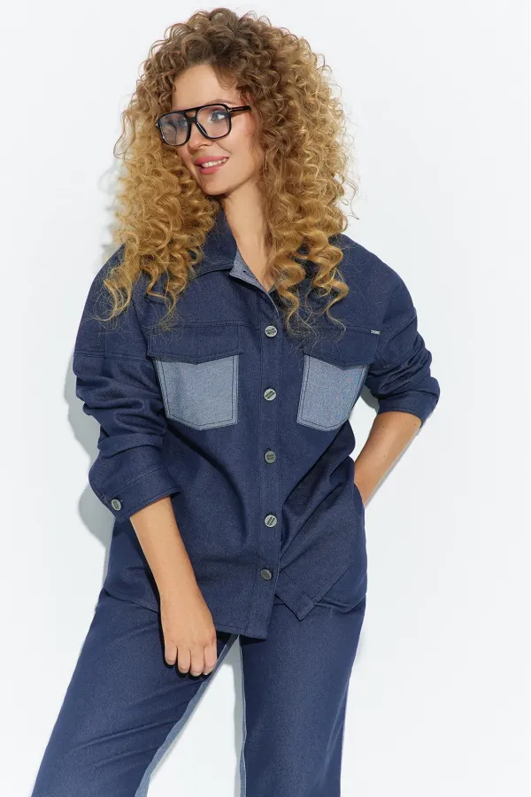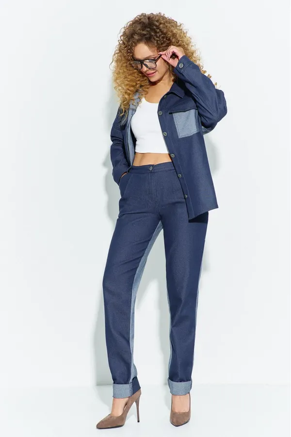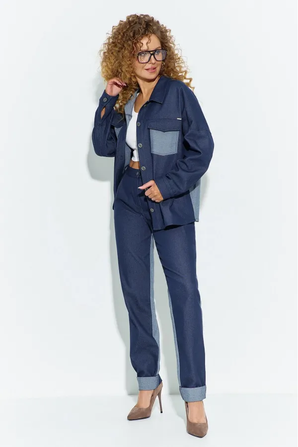 Костюм женский джинсовый состоит из джинсовой рубашки и зауженных брюк- Джинс. Рубашка свободного кроя по переду рубашки расположены симметрично накладные карманы с клапаном и кокетка, горловина- отложной воротник, рукав длинный приспущенный, низ рукава обработан манжетой. Спинка изделия с отрезной кокеткой и декоративным термопринтом.застежеп рубашки петли-пуговицы на планке. Брюки двухцветные (выполнены из двухстороннего денима), с завышенной посадкой, зауженные к низу, по переду брюк расположены карманы в боковых швах и молния на гульфике. Брюки на притачном поясе с застежкой петля-пуговица. На задних полотнищах брюк расположены накладные карманы.