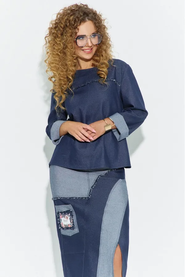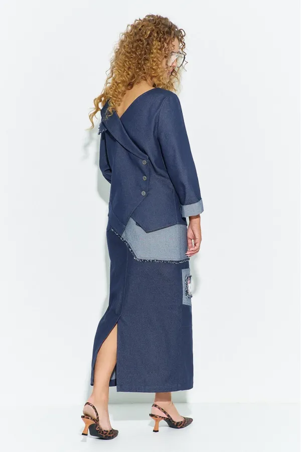Костюм женский юбочный выполнен из джинсовой ткани, состоит из блузона и юбки карандаш в длине миди. Блузон прямого кроя с отрезной кокеткой по переду декорированной бахромой, горловина- лодочка, рукав втачной длинный. Спинка изделия с глубоким V-образным вырезом и имитацией застежки. Юбка зауженная к низу карандаш, в длине миди, имеет ассиметричные декоративные подрезы по передним и задним полотнищам. Юбка на притачном поясе и с застёжкой молния на гульфике, в боковых швах имеются карманы.