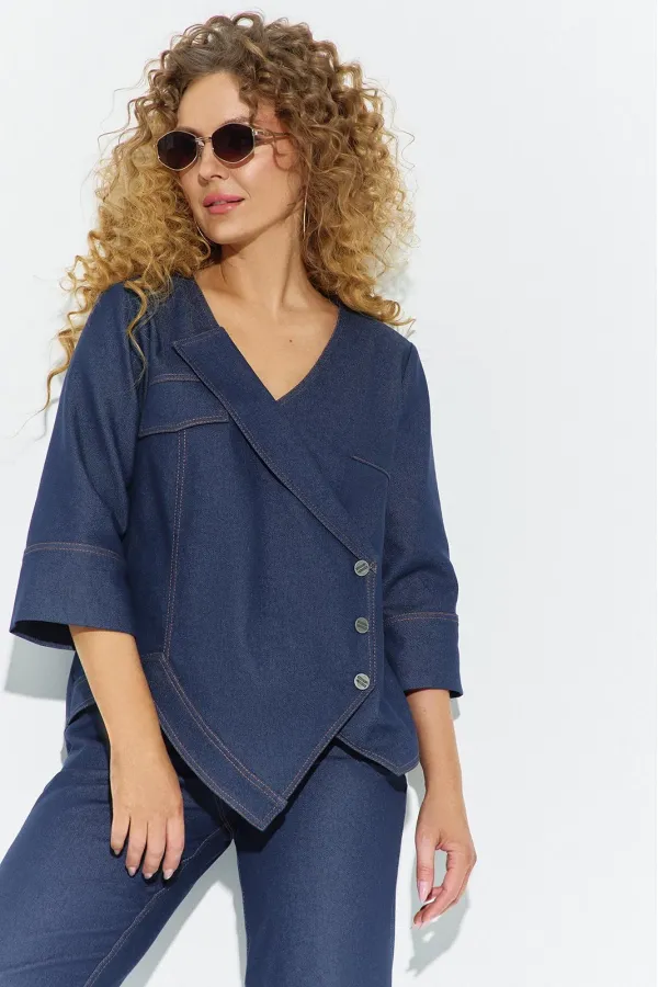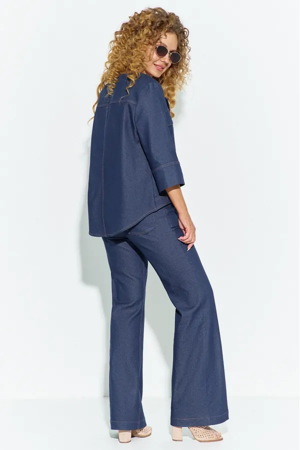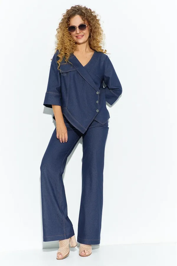Костюм женский двойка с брюками клеш из джинса. Костюм состоит из блузона и брюк, блузон свободного кроя асимметричный, перед асимметричный с V-образным вырезом и отложным лацканом, рукав втачной 3/4 с широкой манжетой по низу. Спинка изделия разрезная с кокеткой. Брюки клеш с небольшим расширением низу, с завышенной посадкой на притачном поясе, в боковых швах расположены карманы, застежки молния на гульфике и петля пуговица на поясе.