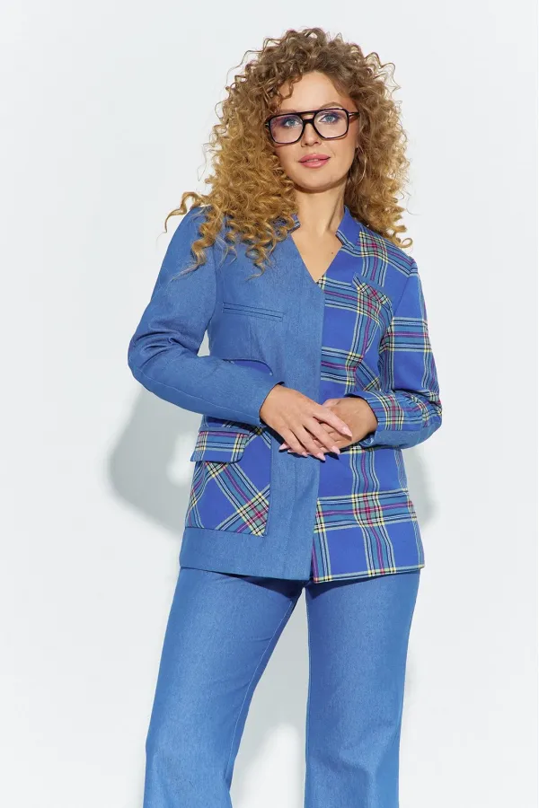 Костюм женский 2х-предметный, состоит из жакета и брюк. Жакет полуприлегающего силуэта выполнен из сочетания тканей Джинса и костюмной ткани, по полочке жакета расположена накладная деталь с функциональным прорезным карманом рамка, и декоративные фальш-карманы в области груди. Рукав втачной длинный. Горловина обработана плоско лежащим воротником-стойкой. Застежка жакета - потайная (супатная) на петли-пуговицы. Жакет на полной подкладке. Брюки классического кроя, с небольшим клешем к низу, с высокой посадкой, выполнены из джинсовой ткани. Пояс в брюках втачной в боковых швах имеются карманы, застежка молния на гульфике и петля-пуговица. На задних полотнищах брюк расположена накладные карманы.