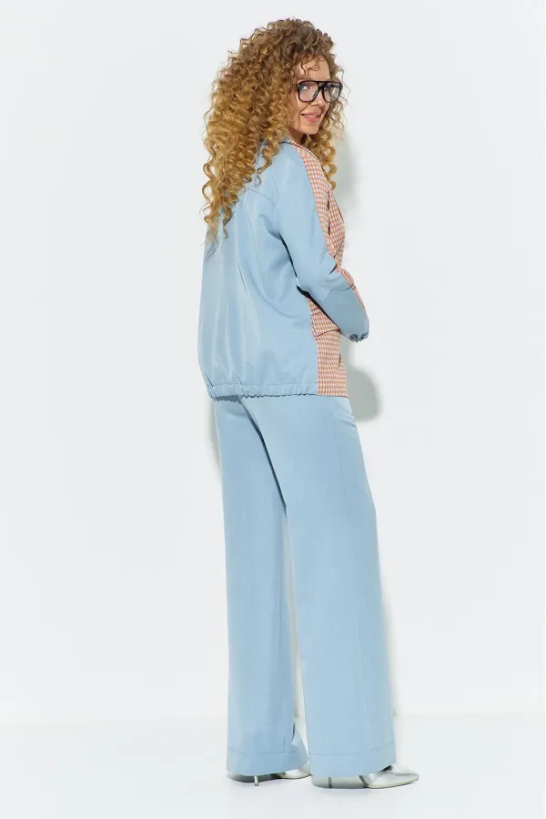 Костюм женский, состоит из жакета и брюк, выполнен в сочетании костюмных тканей. Жакет свободного кроя, не приталенный. Полочка жакета выполнена в стиле классического жакета с прорезными карманами - рамками и английским воротником (отложной воротник с лацканами). Спинка жакета с отрезной кокеткой выделенной ярким кантом, по низу жакета частичная эластичная тесьма. Рукав втачной длинный, по задней (джинсовой) части рукава расположена резинка. Брюки классического кроя, прямые от бедра, с высокой посадкой, в боковых швах расположены функциональные карманы. Пояс в брюках втачной с резинкой, застежка молния на гульфике и петля-пуговица