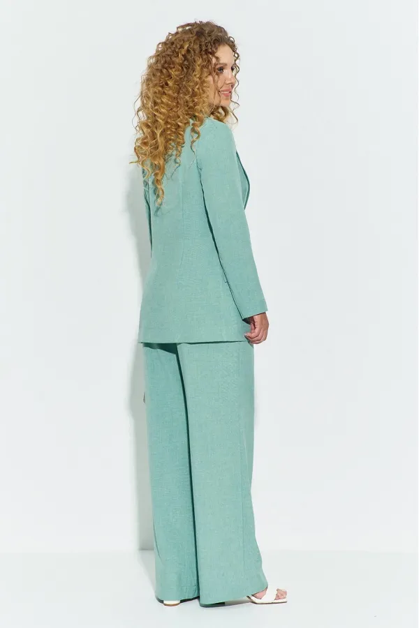 Костюм женский 2-х-предметный состоит из жакета и брюк. Жакет прилегающего кроя, по полочке жакета расположены прорезные карманы с клапанами. Горловина - отложной воротник с лацканами. Рукав втачной длинный. Застежка петля-пуговица. Брюки прямого кроя с высокой посадкой, на притачном поясе со вставками эластичной тесьмы. в боковых швах брюк -палаццо имеются карманы. Застежка - молния на гульфике, петля-пуговица. Жакет без подкладки.