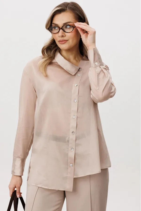 Блуза свободного кроя с рубашечным рукавом, ассиметричной застёжкой, разноуровневым низом, рубашечным воротником.