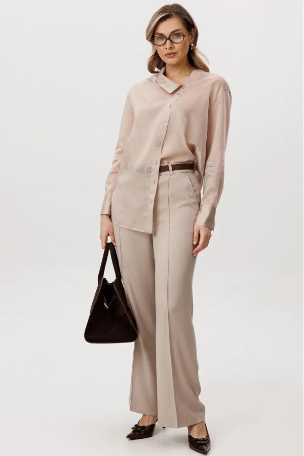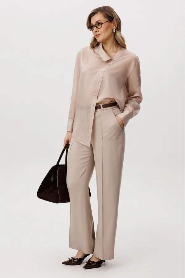 Великолепная двойка: брюки и блуза в одном цвете, но из разнофактурных материалов. Нарочитая женственность, подчеркнутая полупрозрачностью верха и пластичностью брюк.