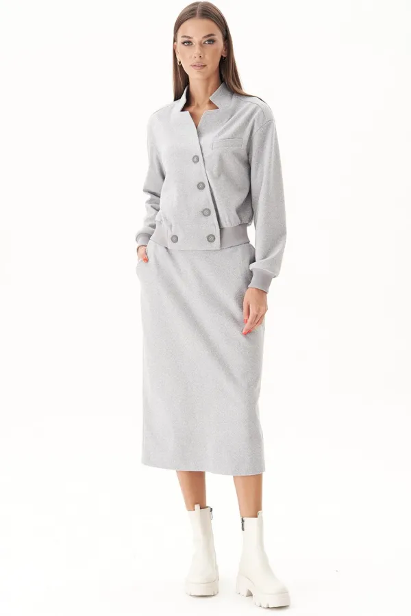 Женские костюмы уже давно стали ответом на вопросы стиля. Костюм - это уже готовый завершенный образ. Один из модных трендов сезона - сочетание юбки длинны миди и укороченного жакета. Модная расцветка, свободный покрой с заниженной линией плеча, воротник - стойка, переходящая в фигурную линию борта. Застежка - двубортная на пуговицы. По низу жакета и рукавов - трикотажный эластичный довяз. Юбка прямая, на передних половинках боковые наклонные карманы. На задних половинках кокетки и накладные карманы в направлении под углом 45 градусов и высокая шлица.