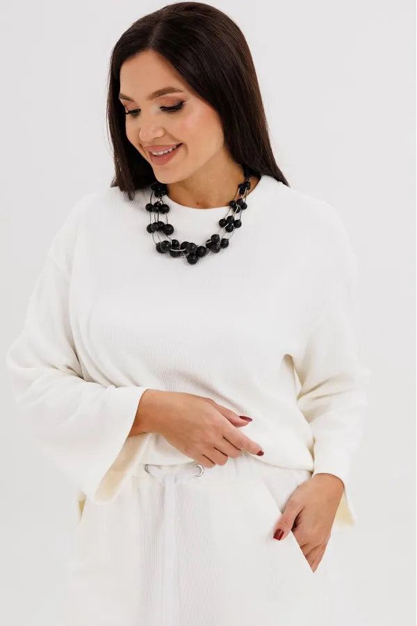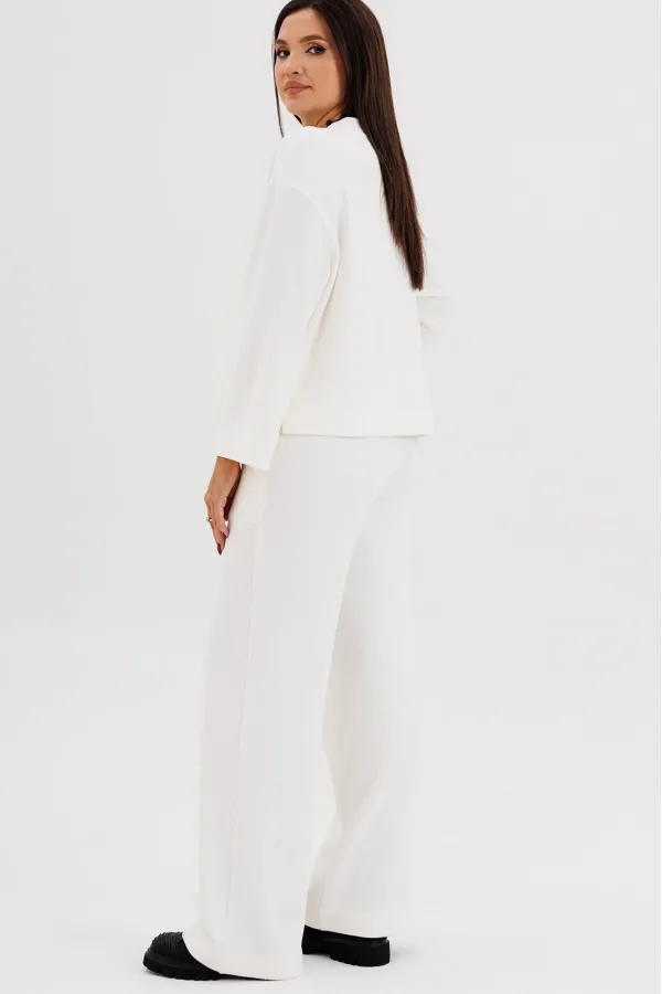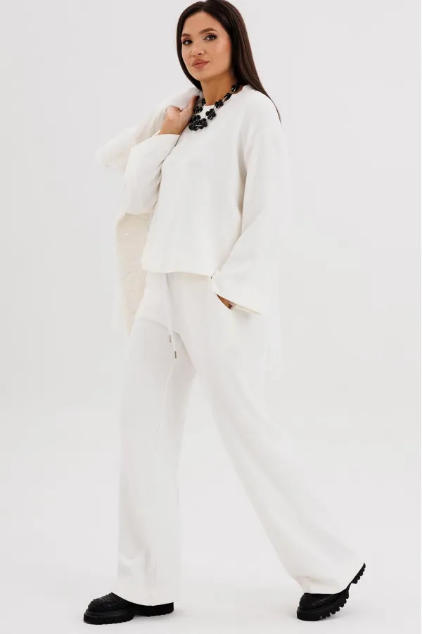 Такой вариант неформального костюма можно отметить отдельно-это настоящий шик, который в любой обстановке смотрится по-особенному. Невероятное ощущение расслабленности и комфорта обеспечивает удобный покрой и тактильно уютный трикотаж с эффектом вельвета. Брюки свободного кроя, прямые, с наклонными боковыми карманами , на эластичном поясе с люверсами и отделочным шнуром. Джемпер рубашечного покроя, свободный, слегка укороченный. Горловина круглая с притачной обтачкой. Рукав рубашечный расширенный к низу.