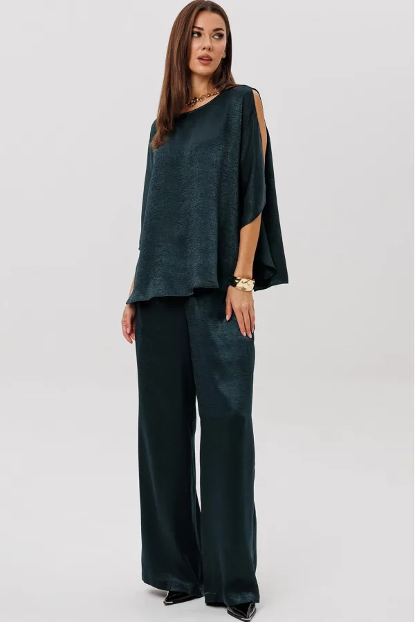 Роскошный брючный комплект из высококачественного атласа — это готовый образ для особых случаев и стильных выходов. Свободная блуза beautifully драпируется, мягко играет на свету и позволяет носить её как в расслабленном варианте, так и подчёркивая талию поясом. Широкие брюки на комфортной резинке создают эффект удлинённых ног и дарят полную свободу движений. Современная элегантность, которая всегда смотрится дорого и effortlessly chic.