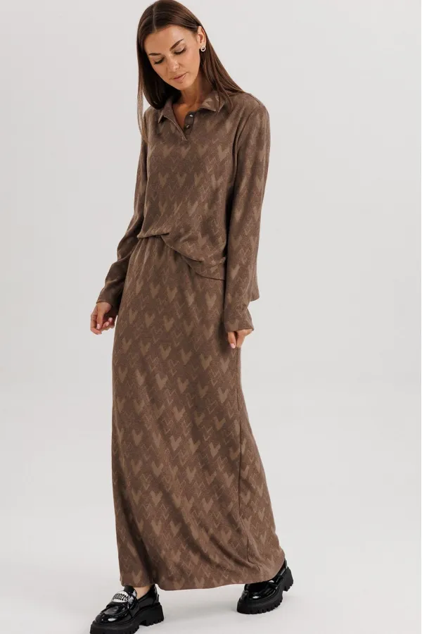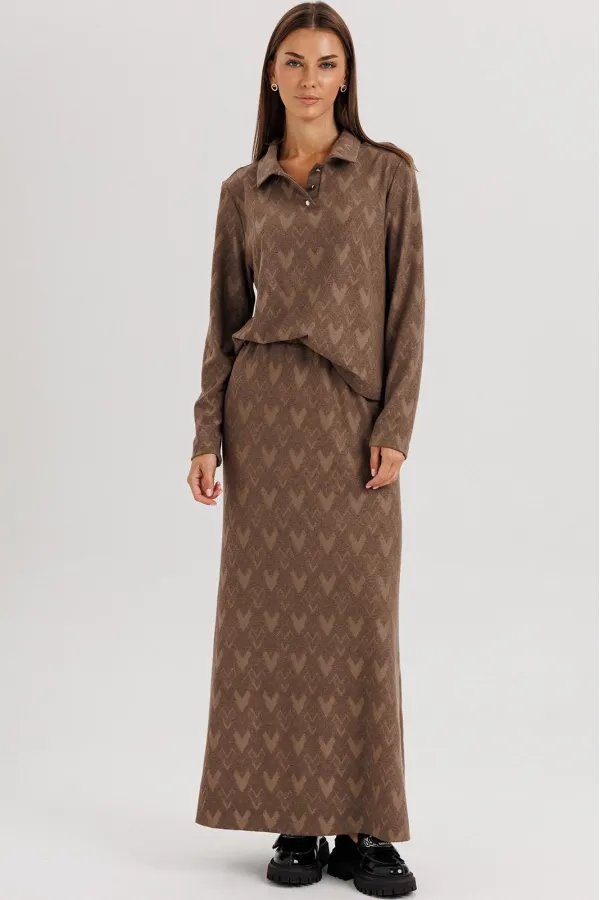 Это модный сет из мягкого трикотажа, включающий в себя джемпер-поло и юбку-«рыбку».