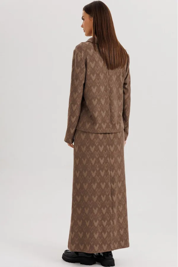 Принт — тонкий геометрический узор в тон ткани, который придаёт образу глубину и динамику.