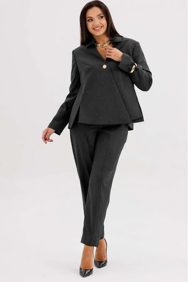 Костюм идеально подойдёт для офисных будней, деловых встреч и стильных повседневных выходов. В нём каждая деталь работает на образ — от благородного оттенка ткани до мягкого блеска люрекса.