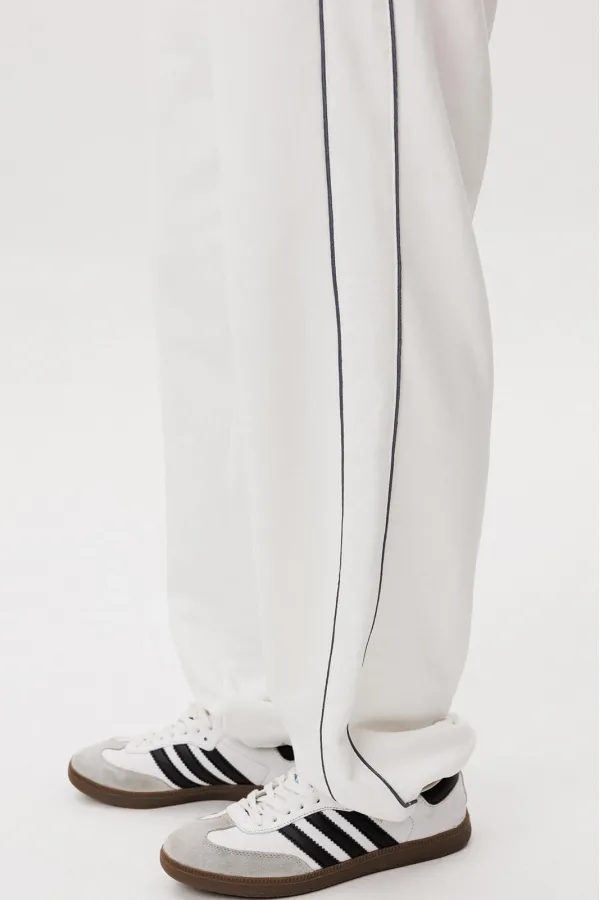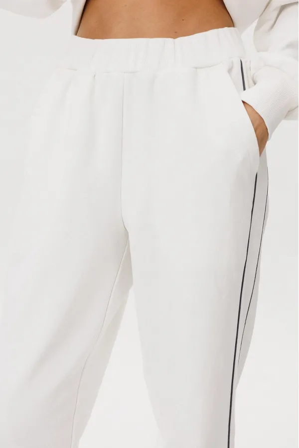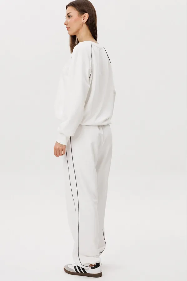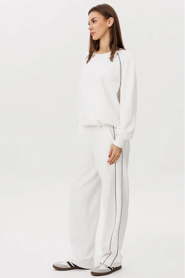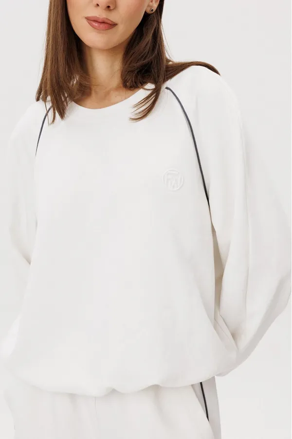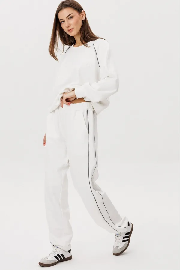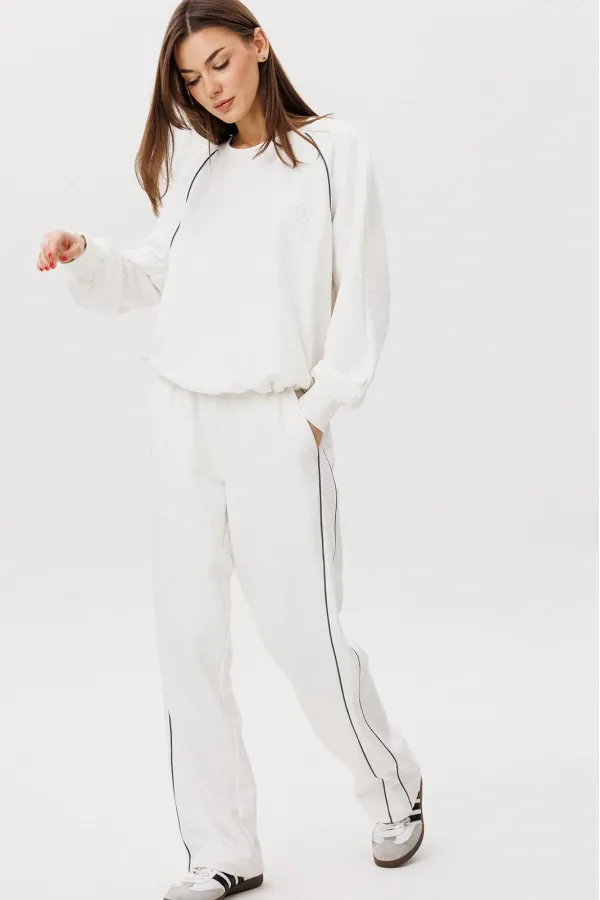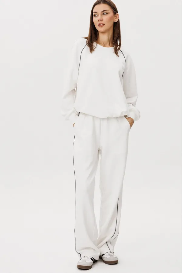 Спортивный костюм не предназначенный для занятия спортом, эдакая разновидность спортивной одежды в современной моде, выражающая характерную для спорта эстетику с помощью динамического кроя и отделки. Свободный свитшот покроя реглан с отделочными контрастными кантами по линии притачивая рукава и брендовой вышивкой на полочке.
