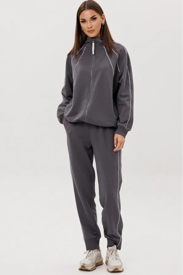 Современный костюм в стиле спорт-кэжуал — идеальный баланс комфорта и актуального дизайна. Модель выполнена из мягкого трикотажного полотна с добавлением хлопка, обеспечивающего приятные тактильные ощущения и свободу движений.