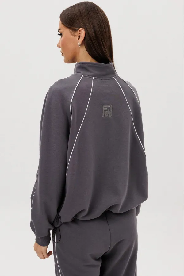 Джемпер покроя реглан с аккуратной стойкой и застёжкой-молнией украшен контрастными кантами, придающими образу динамику. Брюки со слегка зауженным силуэтом и манжетами по низу дополнены эластичным поясом для удобной посадки.