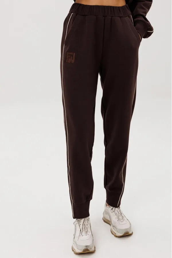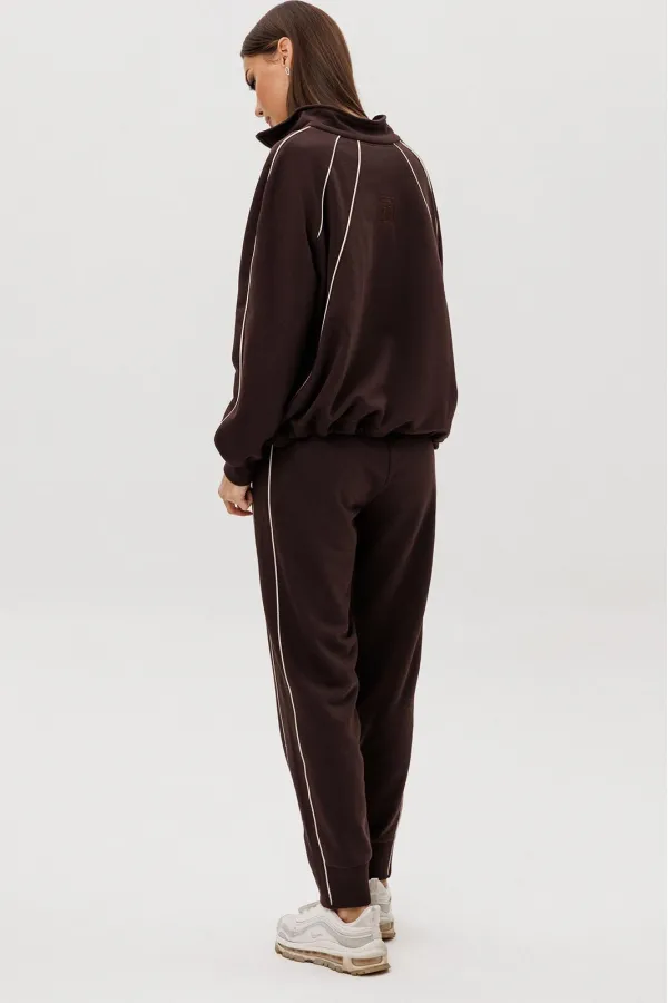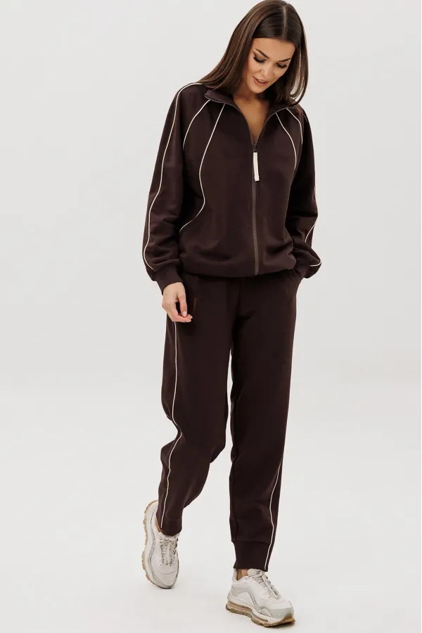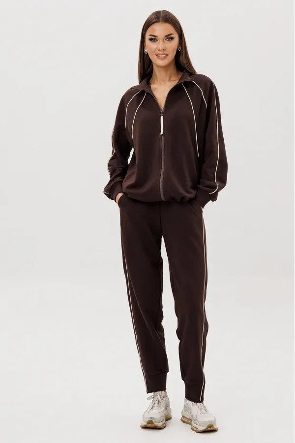 Джемпер покроя реглан с аккуратной стойкой и застёжкой-молнией украшен контрастными кантами, придающими образу динамику. Брюки со слегка зауженным силуэтом и манжетами по низу дополнены эластичным поясом для удобной посадки.
