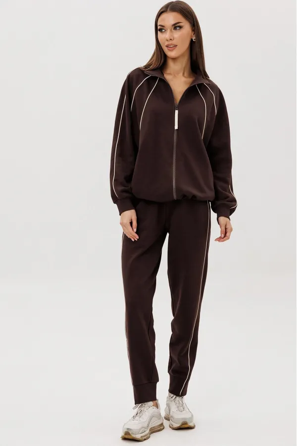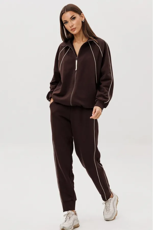 Современный костюм в стиле спорт-кэжуал — идеальный баланс комфорта и актуального дизайна. Модель выполнена из мягкого трикотажного полотна с добавлением хлопка, обеспечивающего приятные тактильные ощущения и свободу движений.