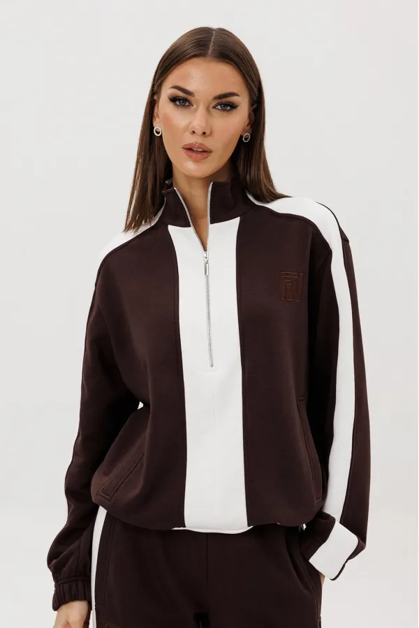 Контрастные лампасы на брюках, рукавах, по центру переда и низу придают модели особую динамичность и изысканность.