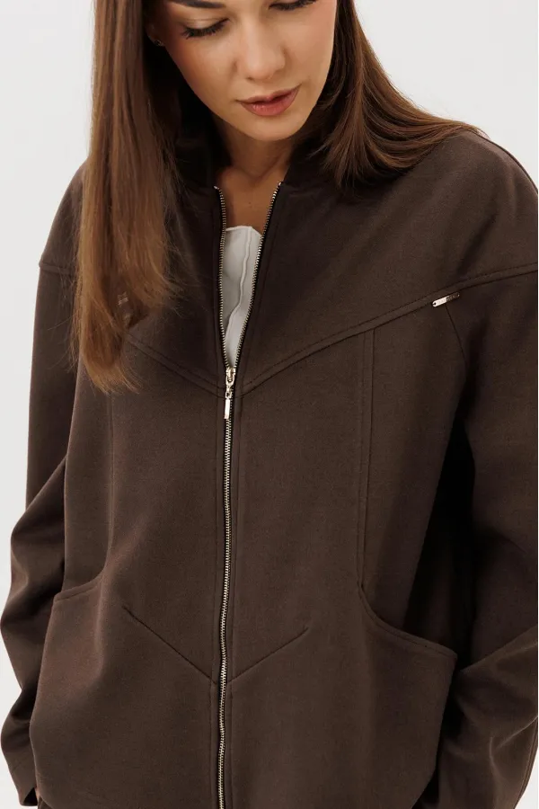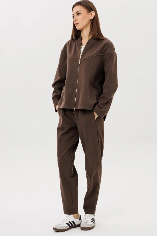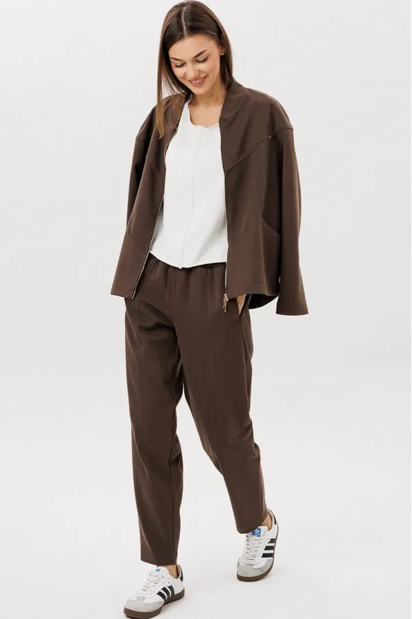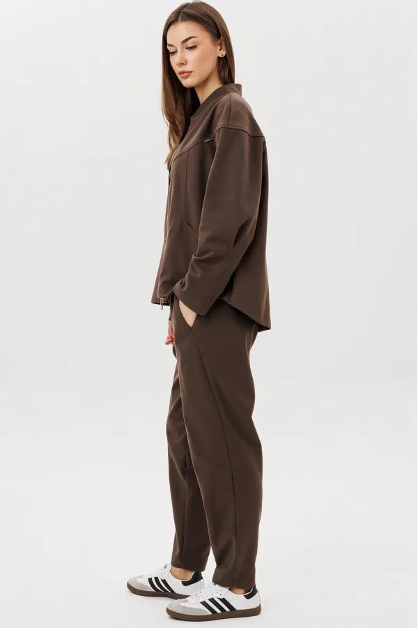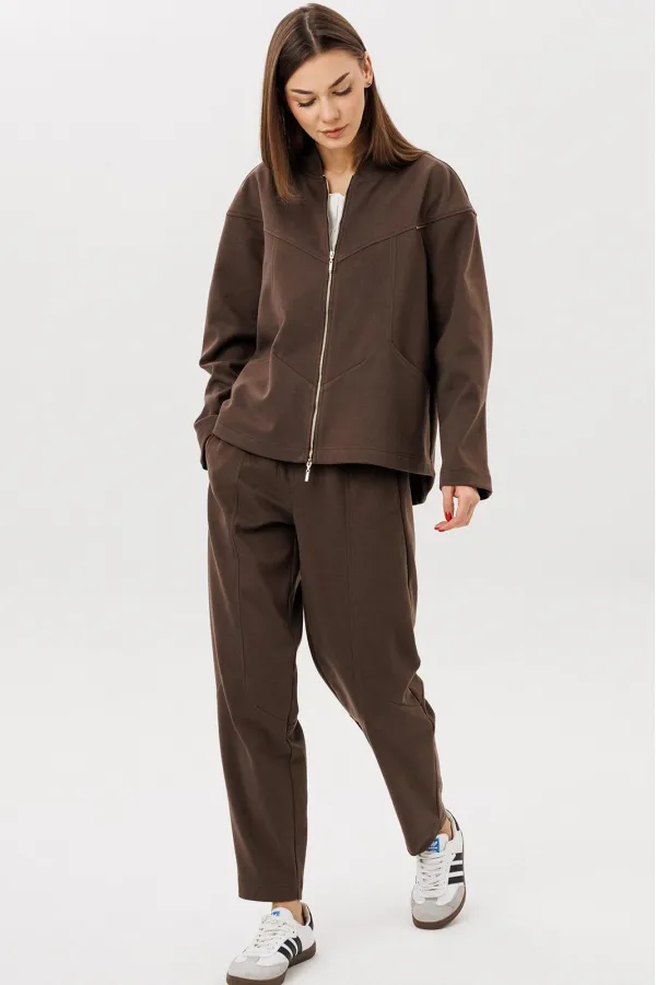 Свободный силуэт, комбинированный покрой, центральная застежка на тесьму-молнию, капюшон рукав-частичный реглан с отрезной широкой манжетой и мягкой складкой в области локтя. Полочка с отрезной кокеткой и фигурным рельефом, переходящим в карман. Спинка с отрезной кокеткой. Брюки свободные, на эластичном поясе в области спинки, с фигурными вертикальными рельефами по центру передних и задних половинок, вытачками в области колена и боковым наклонным карманом. В комплекте топ прилегающего силуэта без рукава.