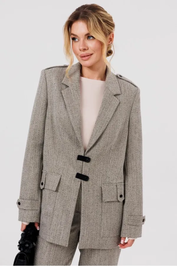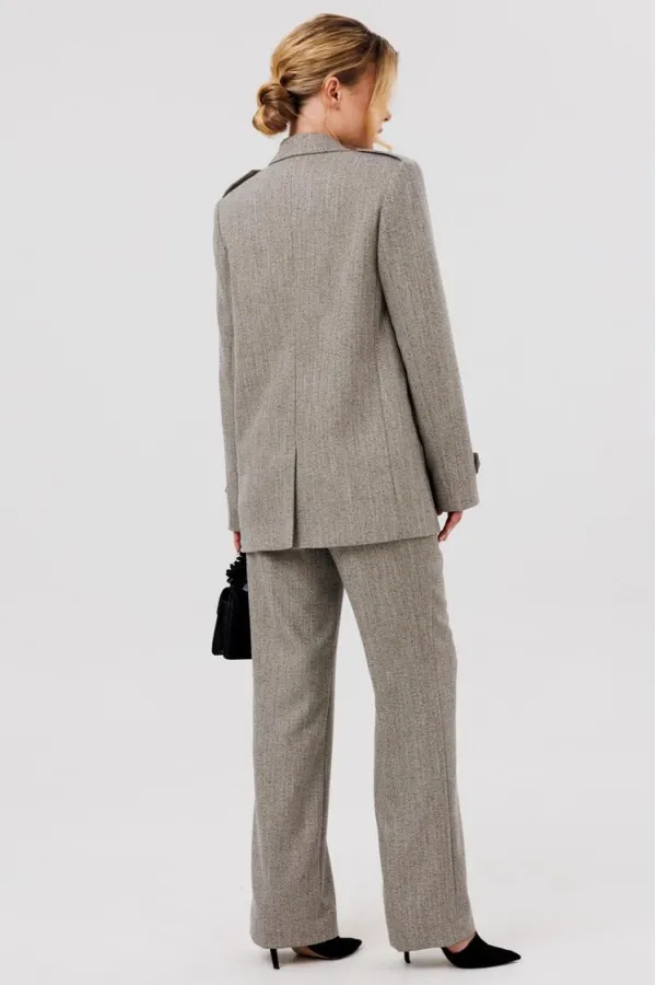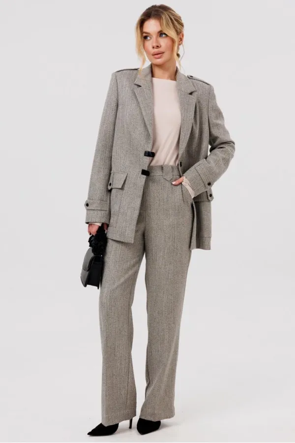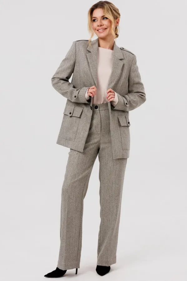 Жакет на подкладке, с функциональными карманами. Застегивается на кнопки. Брюки средней посадки, пояс