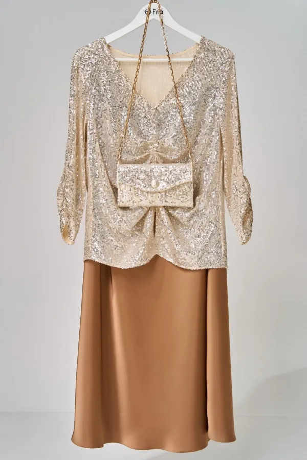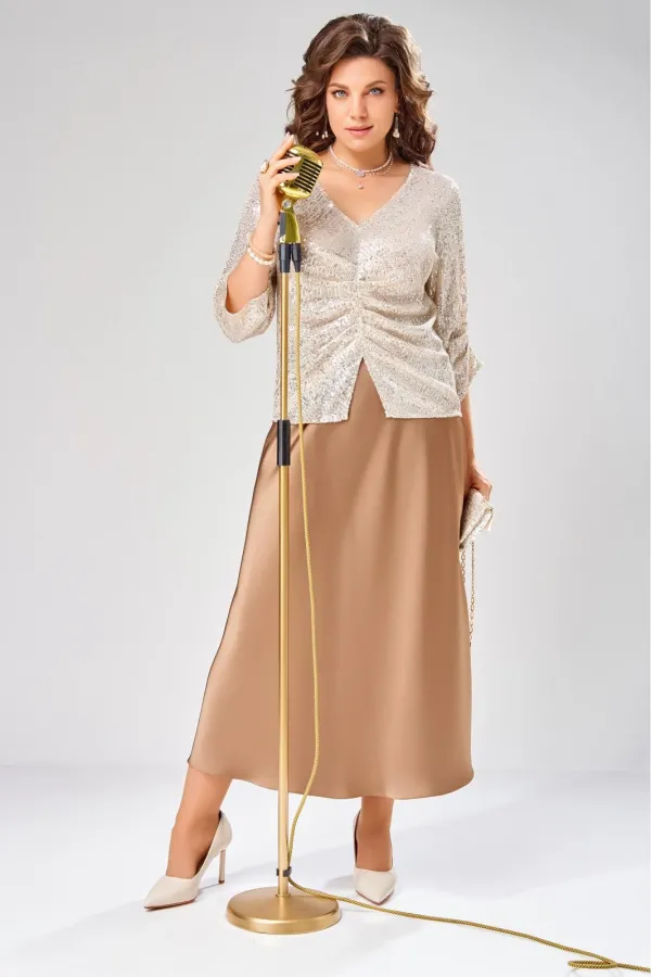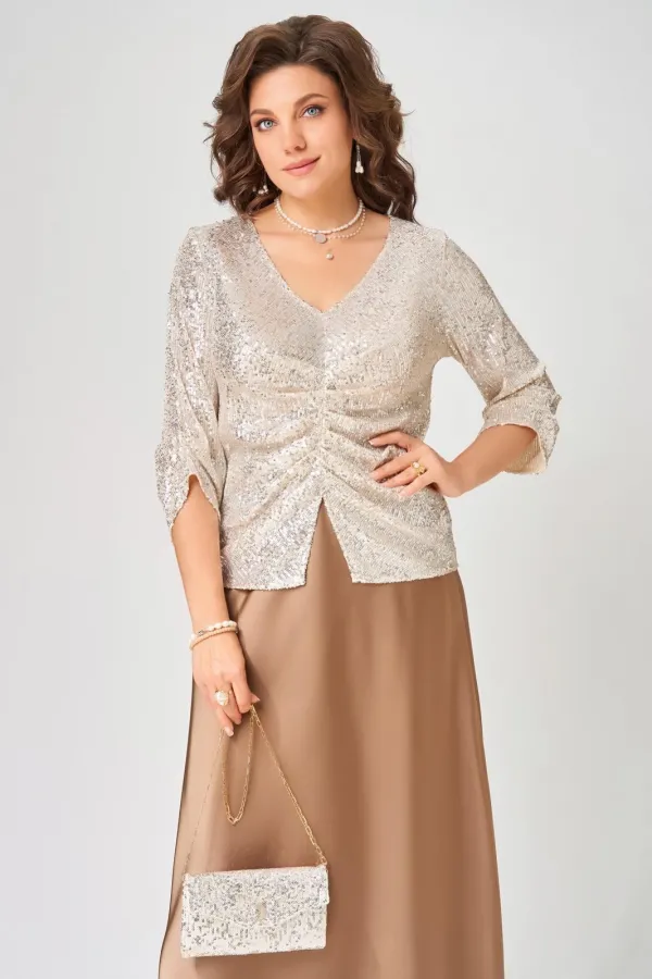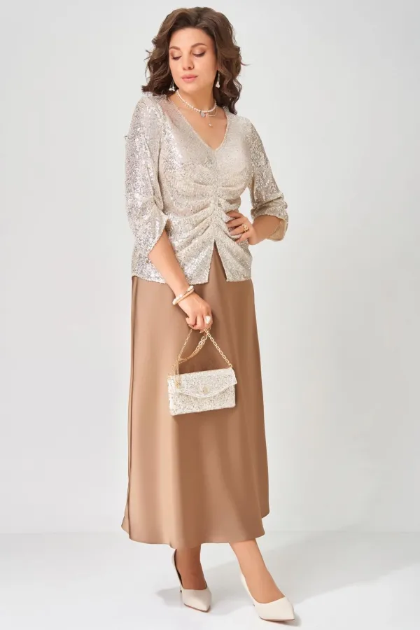 Зария — сияющий акцент вашего новогоднего образа. Блузка, расшитая пайетками, ловит свет при каждом движении, а сатиновая юбка добавляет торжественности и утончённости. Идеальный дуэт для праздников, когда хочется блистать. К этому комплекту в продаже есть сумочка.