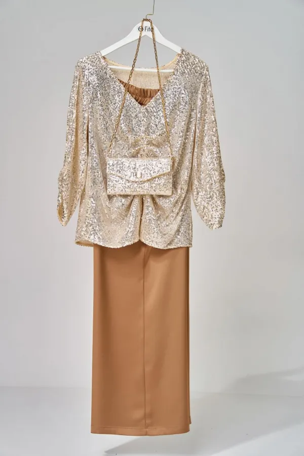 Зария — сияющий образ для особенных вечеров. Блузка, расшитая пайетками, ловит свет и восхищённые взгляды, а сатиновые брюки добавляют элегантности и свободы движения. Идеальный выбор для новогодней ночи, корпоративов и торжеств, где хочется блистать.