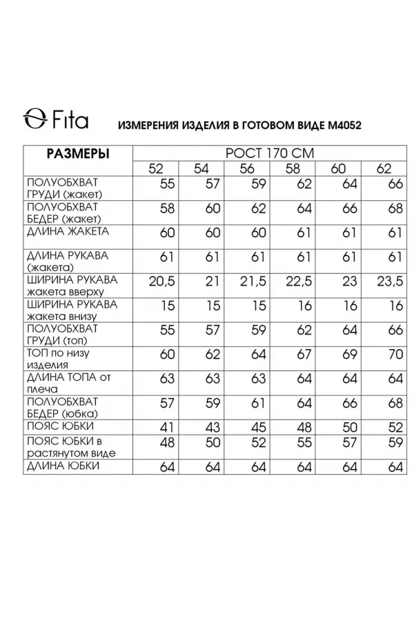 Ткань | жакет: 60% вискоза 36% полиамид 4% спандекс; юбка: 70% полиэстер 30% вискоза; блузка: 95% искусственный шелк 5% спандекс. |