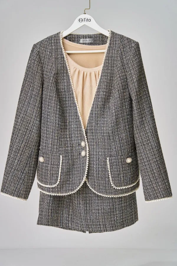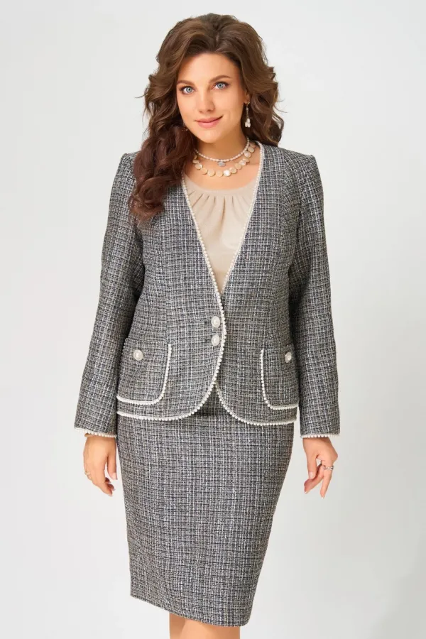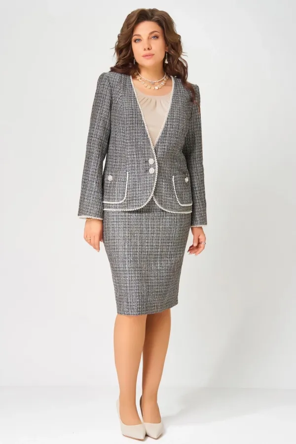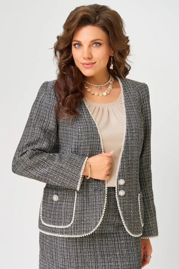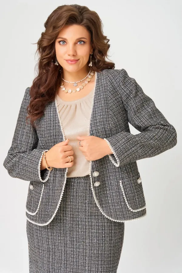 Ясиня — нарядная тройка, которая легко впишется в повседневность. Жакет, юбка и джемпер создают элегантный образ, подходящий как для торжеств, так и для рабочих будней. Стиль, комфорт и женственность — в каждой детали.
