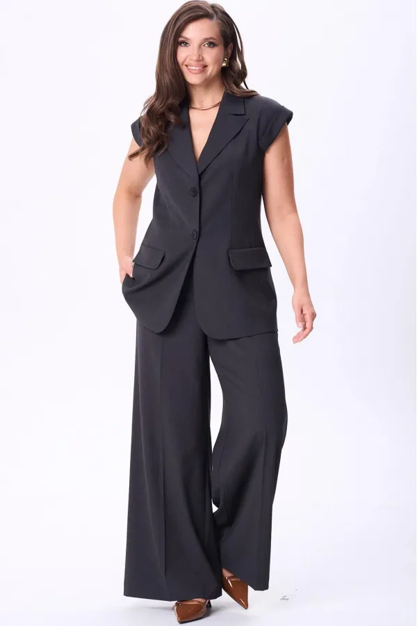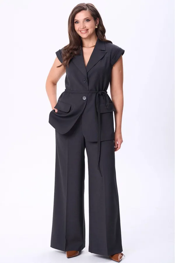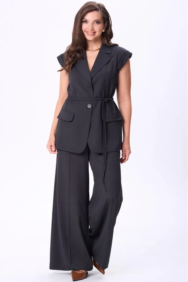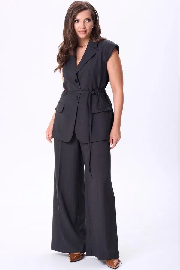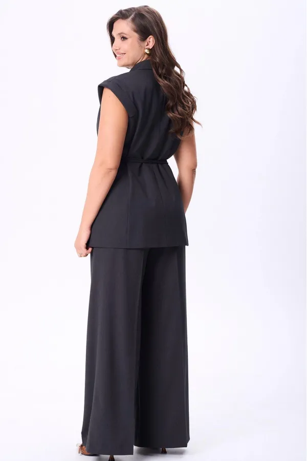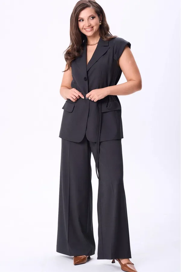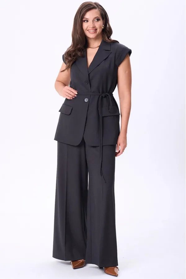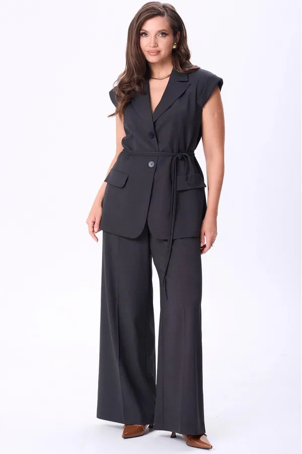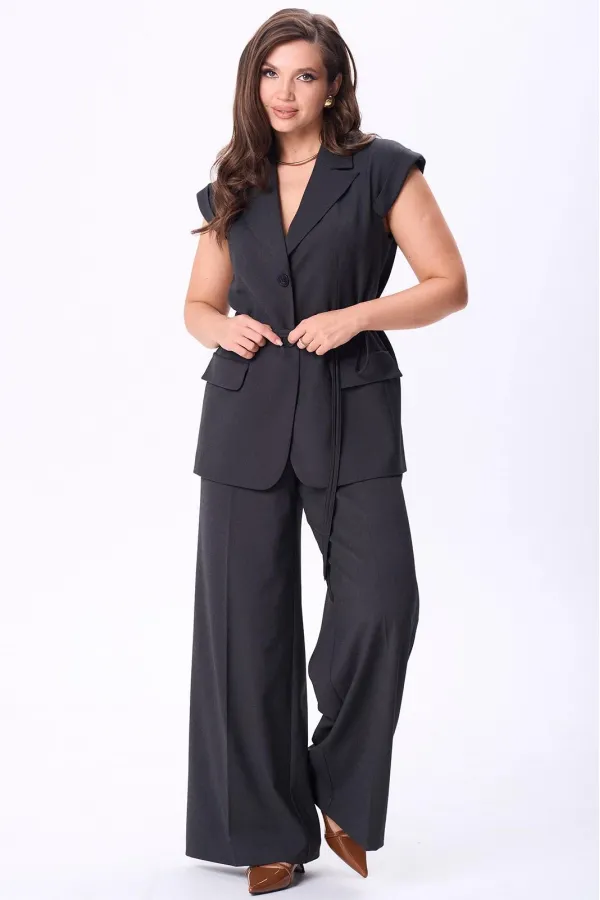 Костюм состоит из жилета и брюк, выполненых из костюмной ткани. Жилет полуприлегающего силуэта с воротником пиджачного типа. Перед с рельефами, талиевой вытачкой и декоративным клапаном. Застежка центральная однобортная на 2 петли и пуговицы. Спинка со средним швом и рельефами. Вдоль оката рукава выполнена декоративная планка. К жилету прилагается тонкий пояс из основной ткани. Брюки расширенные книзу с притачным поясом. Спереди застежка гульфик на молнии и с петлей и пуговицей по поясу. По задней частям брюк вытачки. В боковых швах карманы с наклонным входом. По поясу широкие шлевки. Брюки с заутюженными стрелками . Длина жилета - 71 см, длина брюк с учетом пояса - 109 см.