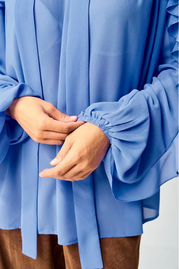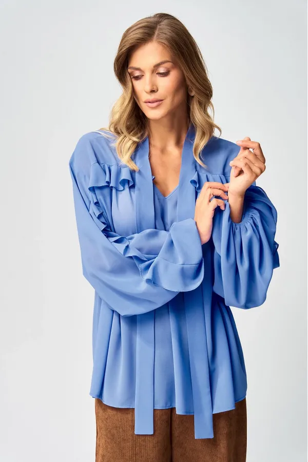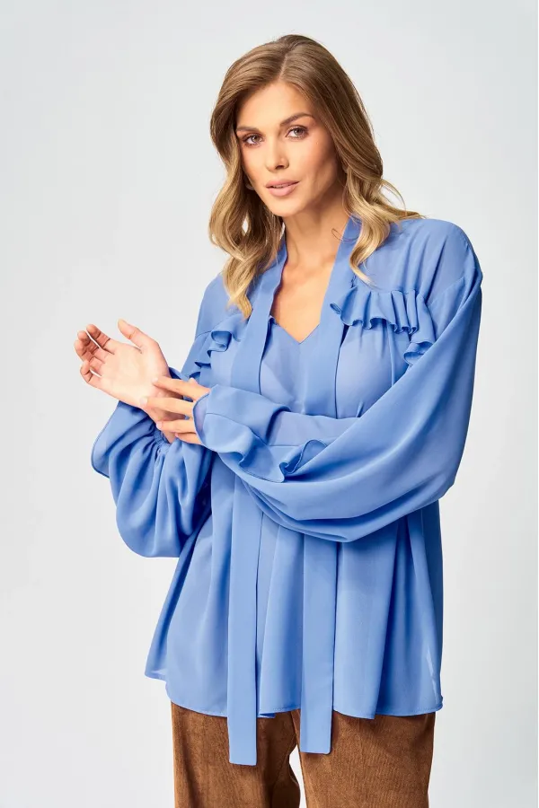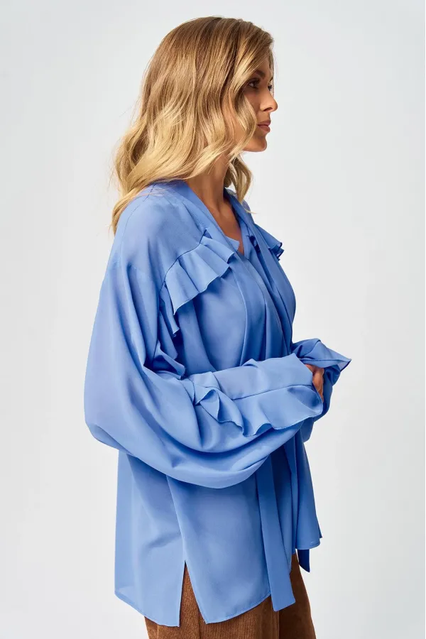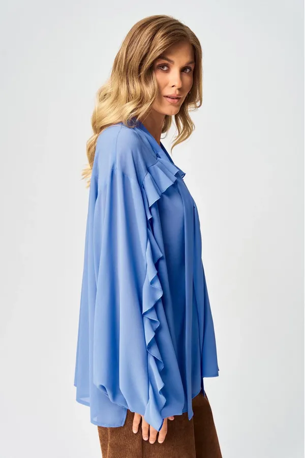Блузка свободного силуэта из струящейся шифоновой ткани. Перед и спинка с кокеткой и сборкой. Рукав спущенный свободный с резинкой понизу. Вдоль линии кокетки и рукава вставлена рюша. Горловина V-образной формы с воротни... Читать далее...