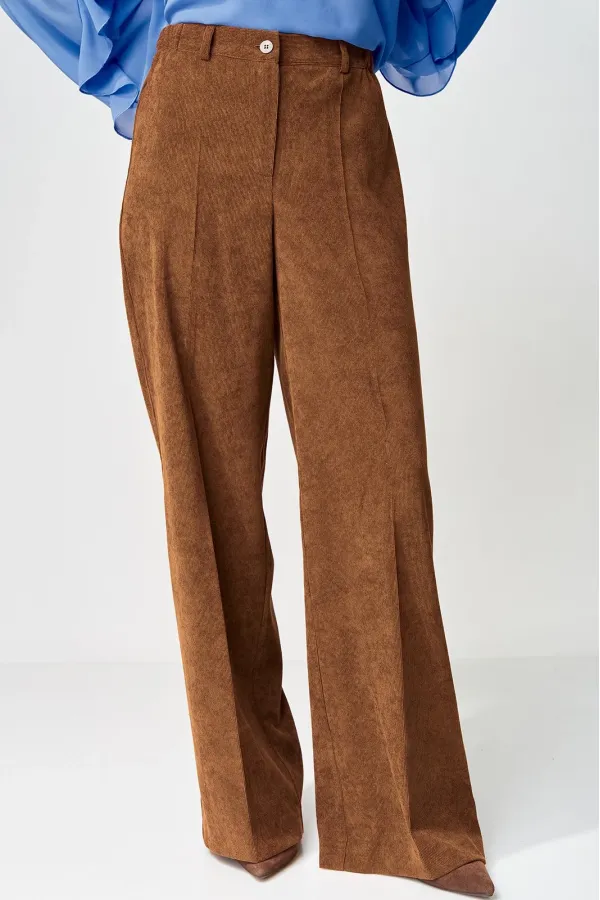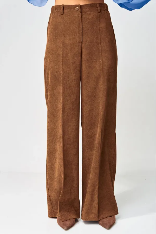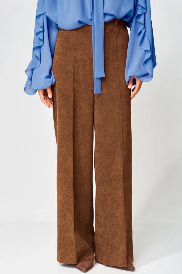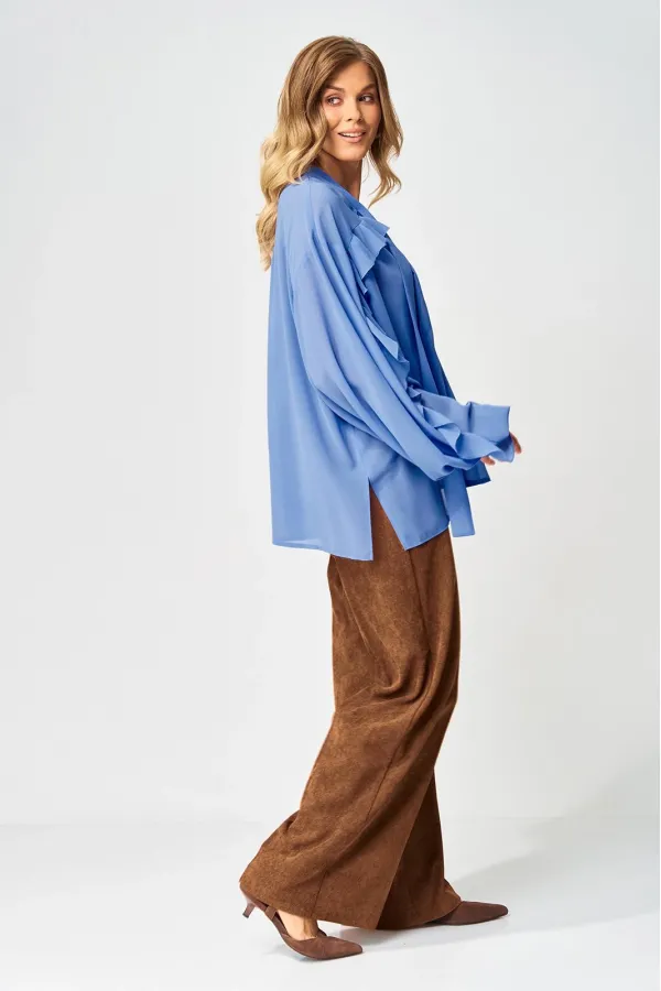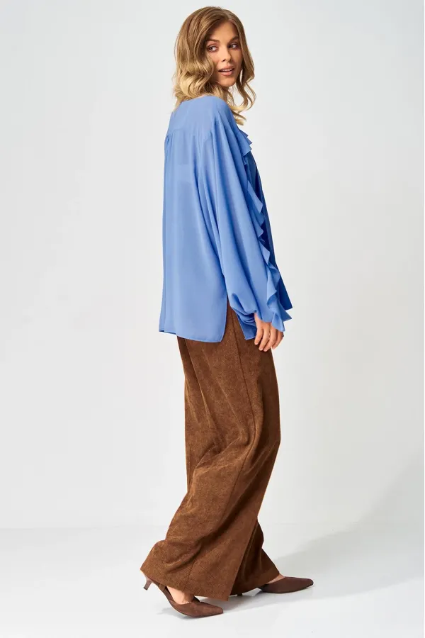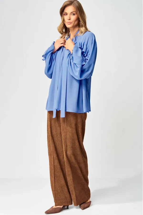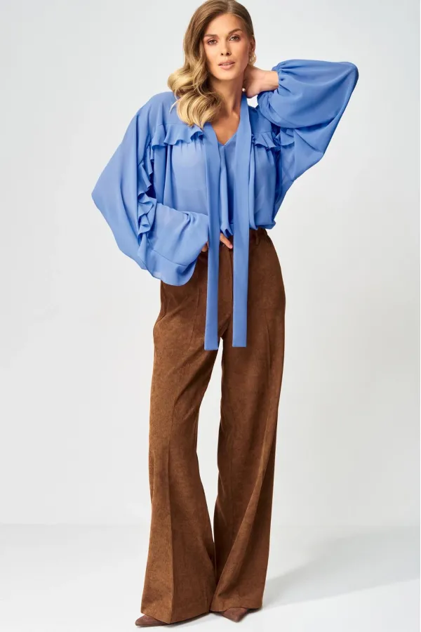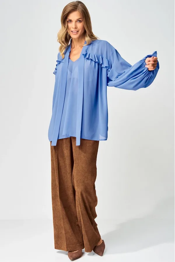Блузка свободного силуэта из струящейся шифоновой ткани. Перед и спинка с кокеткой и сборкой. Рукав спущенный свободный с резинкой понизу. Вдоль линии кокетки и рукава вставлена рюша. Горловина V-образной формы с воротником стойкой переходящей в бант. Брюки палаццо с притачным поясом из мягкой вельветовой ткани. Спереди застежка гульфик на молнии и петлей и пуговицей по поясу. По задней частям брюк вытачки. Пояс с резинкой в боковых частях. Брюки с заутюженными стрелками. Длина блузки - см, длина рукава - см. Длина брюк с учетом пояса - 109 см.
